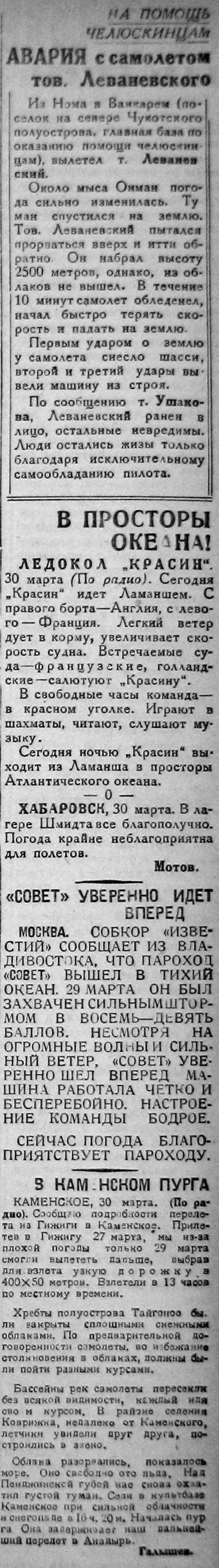 Тов. Леваневский показал непревзойденный пример находчивости. Проваливаясь в снежную пелену, быстро падая, тов. Леваневский сохранял присутствие духа и сдержал машину от сокрушительного толчка о землю. Пилот спас экипаж самолета исключительно благодаря своему опыту и спокойному управлению самолетом. Густой слепящий снег при штормовом ветре силой от 10 до 12 баллов, идет не порывами, как это бывает в средней полосе, в Казахстане, — полярная пурга идет беспрерывно с ветром одной и той же силы в течение нескольких дней подряд. Я зимовал западнее Ванкарема, в Чаунской губе. Там в апреле было только несколько дней с пургой, а остальное время стояла ясная погода. Хуже будет в мае. Тогда начнется таяние, передвижка льдов и возможны туманы.