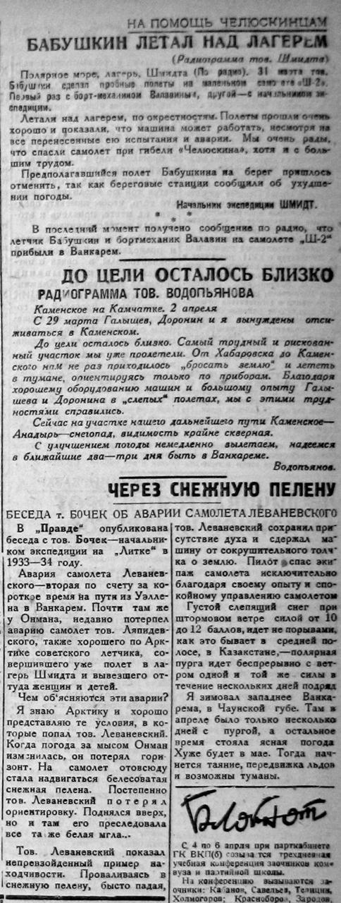 31 марта тов. Бабушкин сделал пробные полеты на своем маленьком самолете: первый раз с бортмехаником Валавиным, а второй — с начальником экспедиции. Летали над лагером и окрестностями. Полеты прошли очень хорошо и показали, что машина может работать, несмотря на все перенесенные испытания и аварии. Мы очень рады, что спасли самолет при гибели «Челюскина», хотя и с большим трудом.