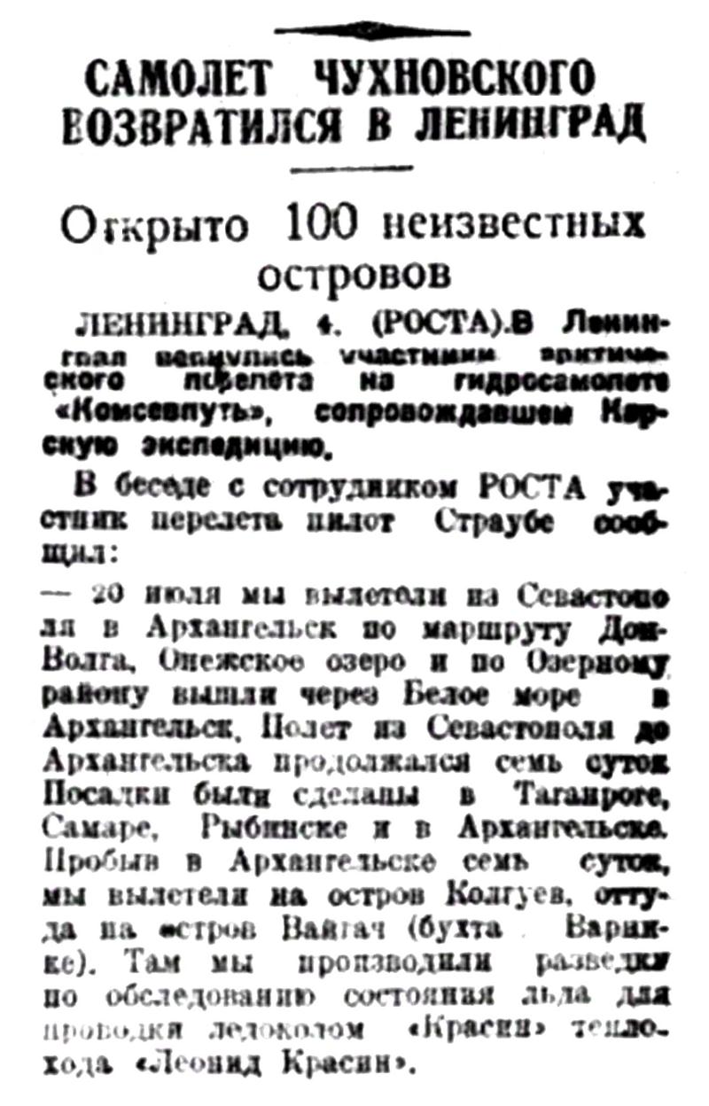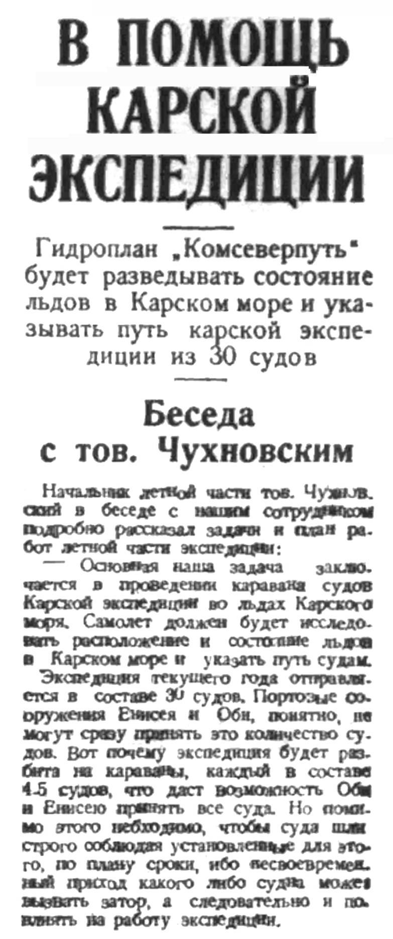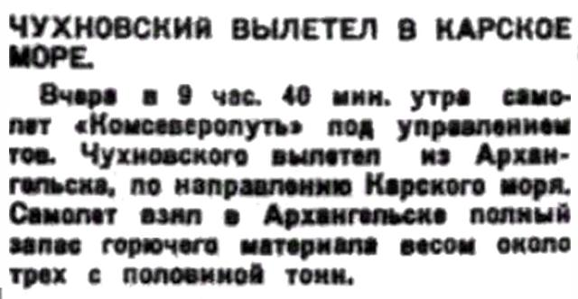 Вчера в 9 час. 40 мин. утра самолет «Комсеверопуть» под управлением тов. Чухновского вылетел из Архангельска, по направлению Карского моря. Самолет взял в Архангельске полный запас горючего материала весом около трех с половиной