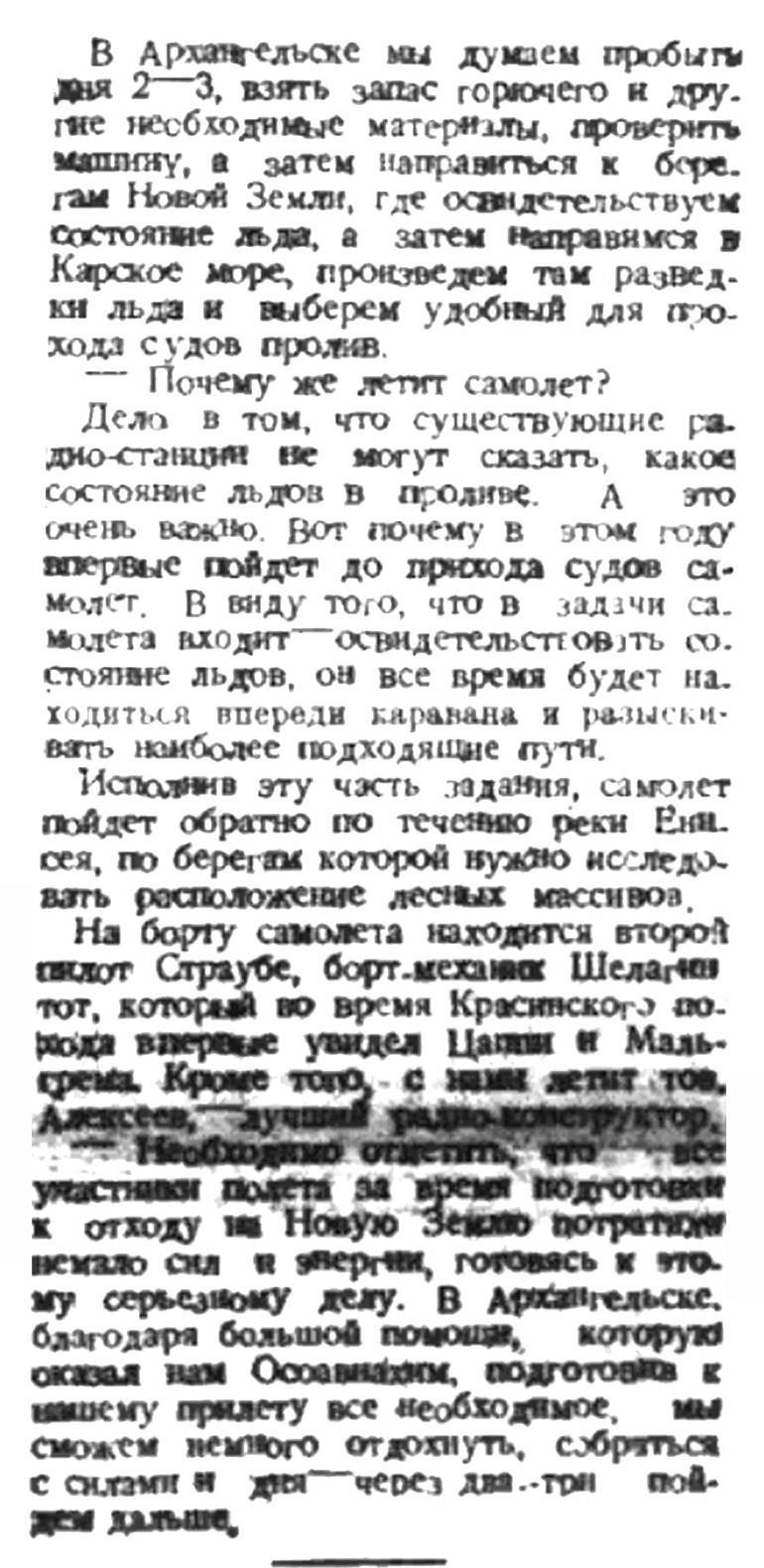 - Необходимо отметить, что все участники полета за время подготовки к отходу на Новую Землю потратили немало сил и энергии, готовясь к этому серьезному делу. В Архангельске, благодаря большой помощи, которую оказал нам Осоавиахим, подготовив к нашему прилету все необходимое, мы сможем немного отдохнуть, собратья с силами и дня через два-три пойдем дальше.