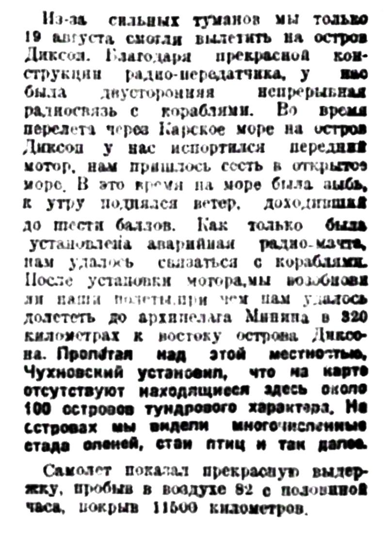 Из-за сильных туманов мы только 19 августа смогли вылететь на остров Диксон. Благодаря прекрасной конструкции радио-передатчика, у нас была двусторонняя непрерывная радиосвязь с кораблями. Во время перелета через Карское море на остров Диксон у нас испортился передний мотор, нам пришлось сесть в открытом море. В это время на море была зыбь, к утру поднялся ветер, доходивший до шести баллов. Как только была установлена аварийная радио-мачта нам удалось связаться с кораблями. После установки мотора, мы возобновили наши полеты, при чем нам удалось долететъ до архипелага Минина в 320 километрах к востоку острова Диксона. Пролетая над этой местностью, Чухновский установил, что на карте отсутствуют находящиеся здесь около 100 островов тундрового характера. На островах мы видели многочисленные стада оленей, стаи птиц и так далее.