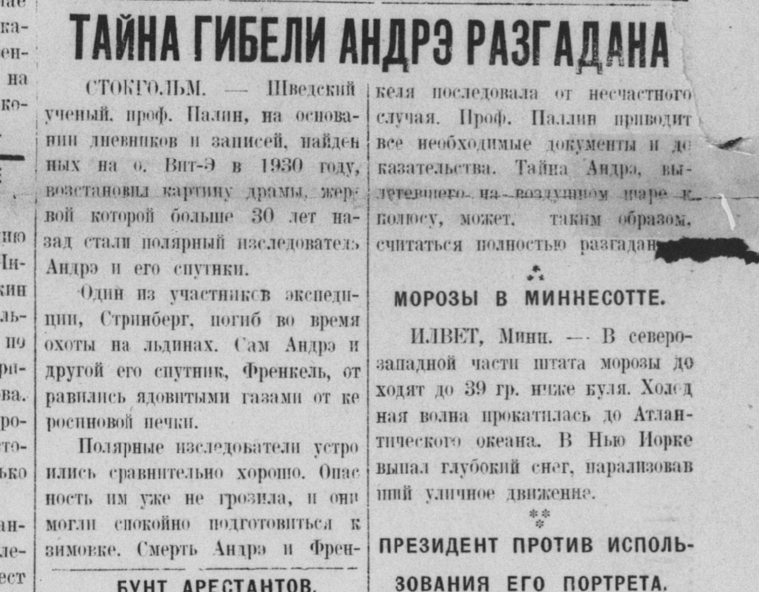 В конце 30-х годов тайной гибели трех аэронавтов заинтересовался датский врач Эрпет Адам Трайд. Он с детства увлекался книгами о полярных экспедициях. Об Андре он знал все, что только можно было знать, и тщательно анализировал появлявшиеся в печати версии его гибели.