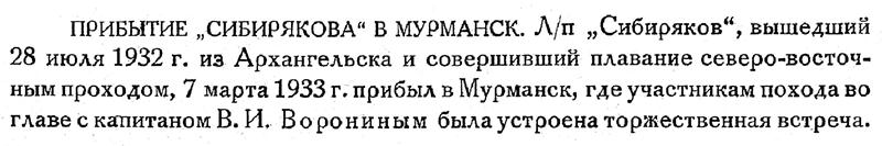 ПРИБЫТИЕ „СИБИРЯКОВА" В МУРМАНСК. Л/п „Сибиряков", вышедший 28 июля 1932 г. из Архангельска и совершивший плавание северо-восточным проходом, 7 марта 1933 г. прибыл в Мурманск, где участникам похода во главе с капитаном В. И. Ворониным была устроена торжественная встреча.