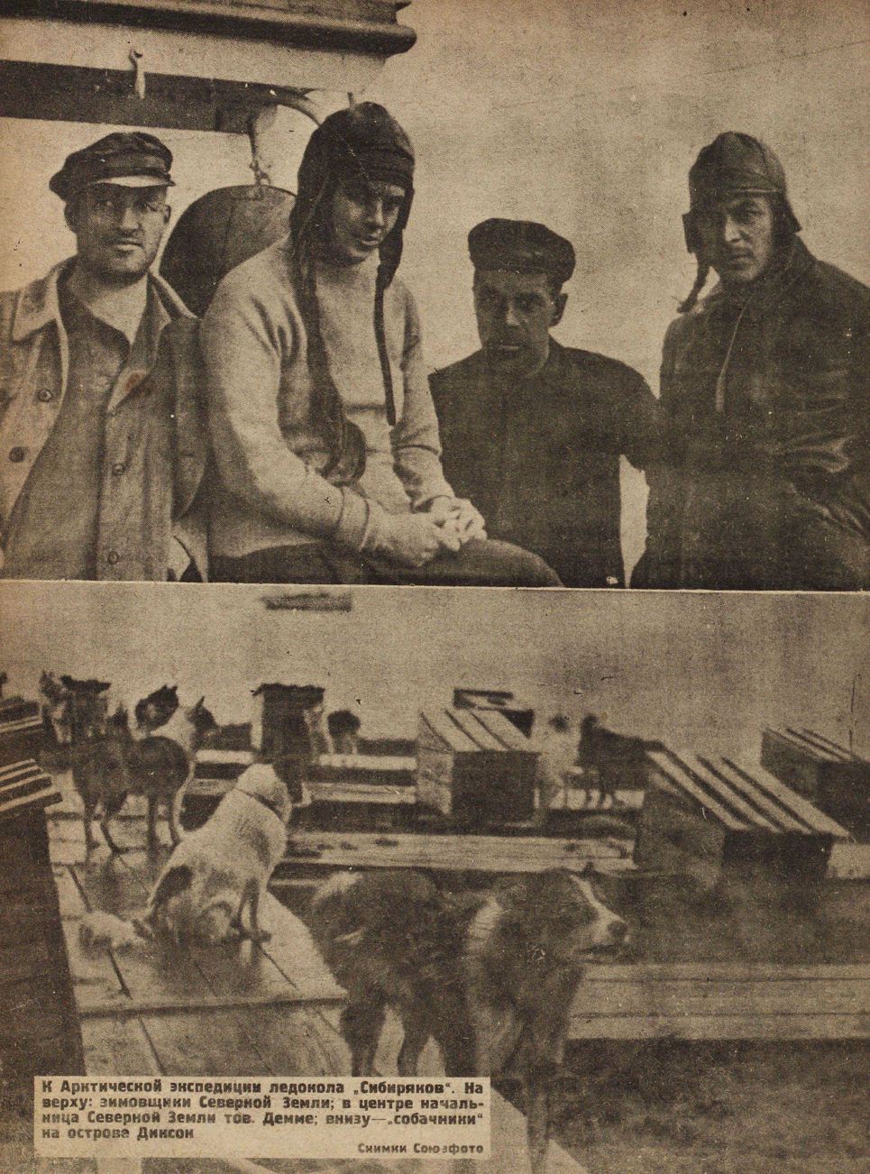 К Арктической экспедиции ледокола „Сибиряков“. На верху: зимовщики Северной Земли; в центре начальница Северной Земли тов. Демме; внизу—„собачники“ на островя Диксон.