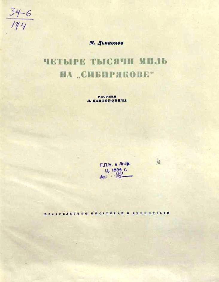 Дьяконов М. А.Четыре тысячи миль на "Сибирякове" / М. Дьяконов ; Рис. Л. Канторовича. - [Ленинград] : Изд-во писателей в Ленинграде, [1934] (тип. им. тов. Лоханкова и тип. им. Ив. Федорова).
