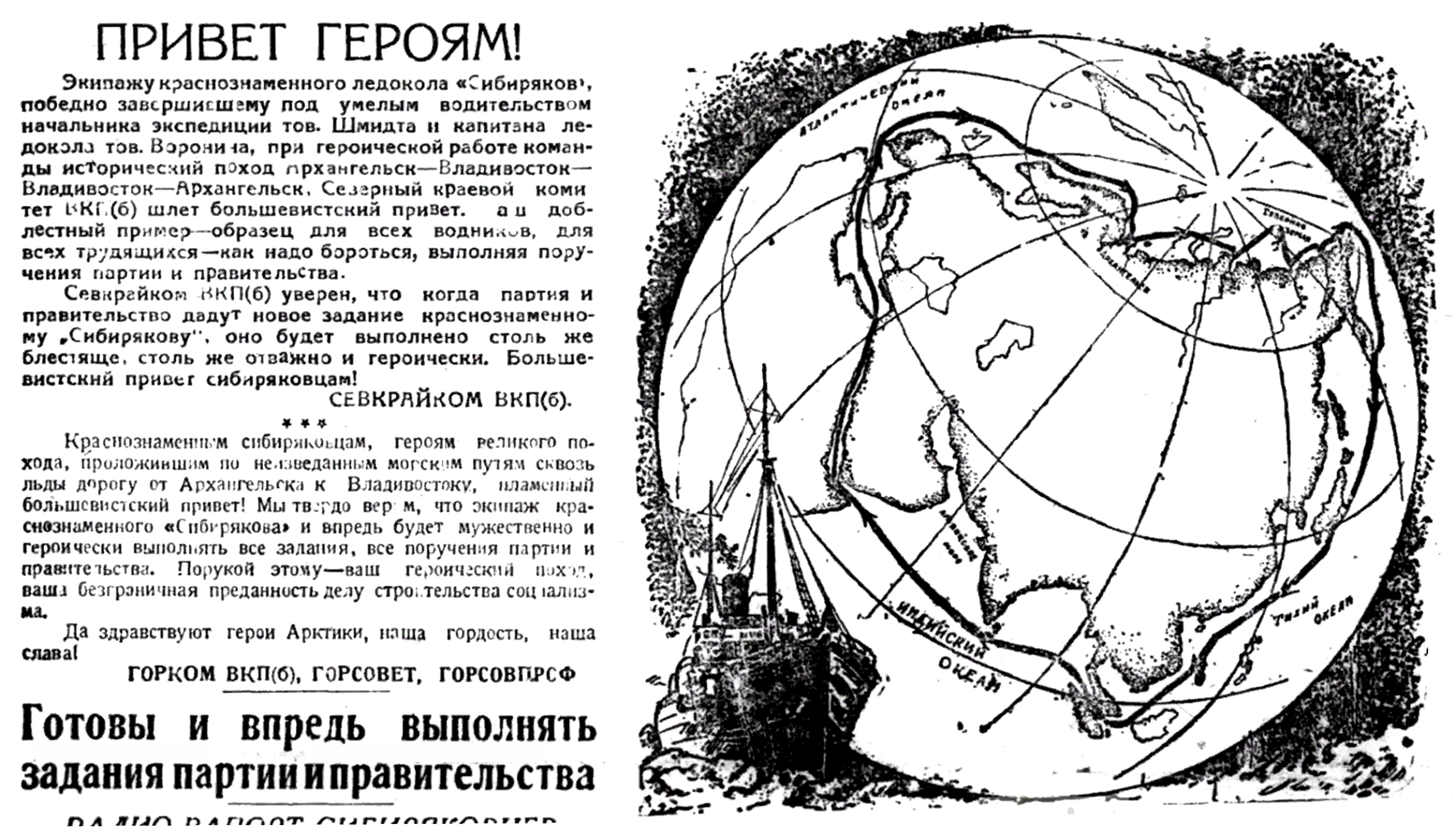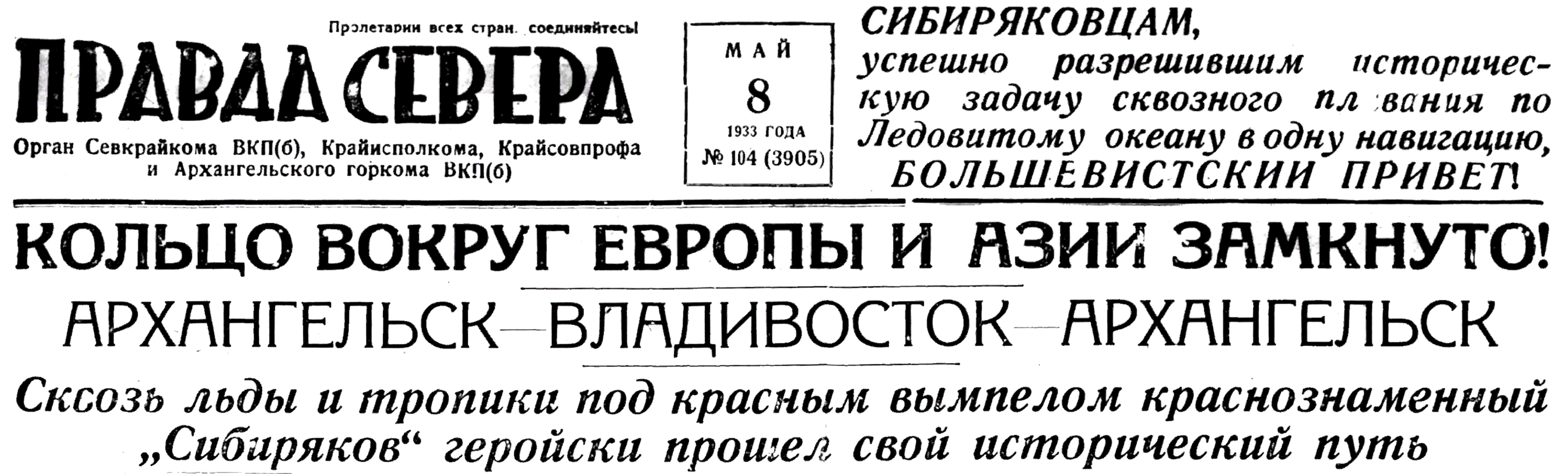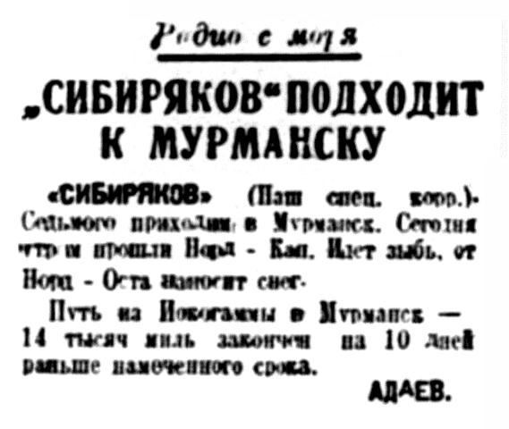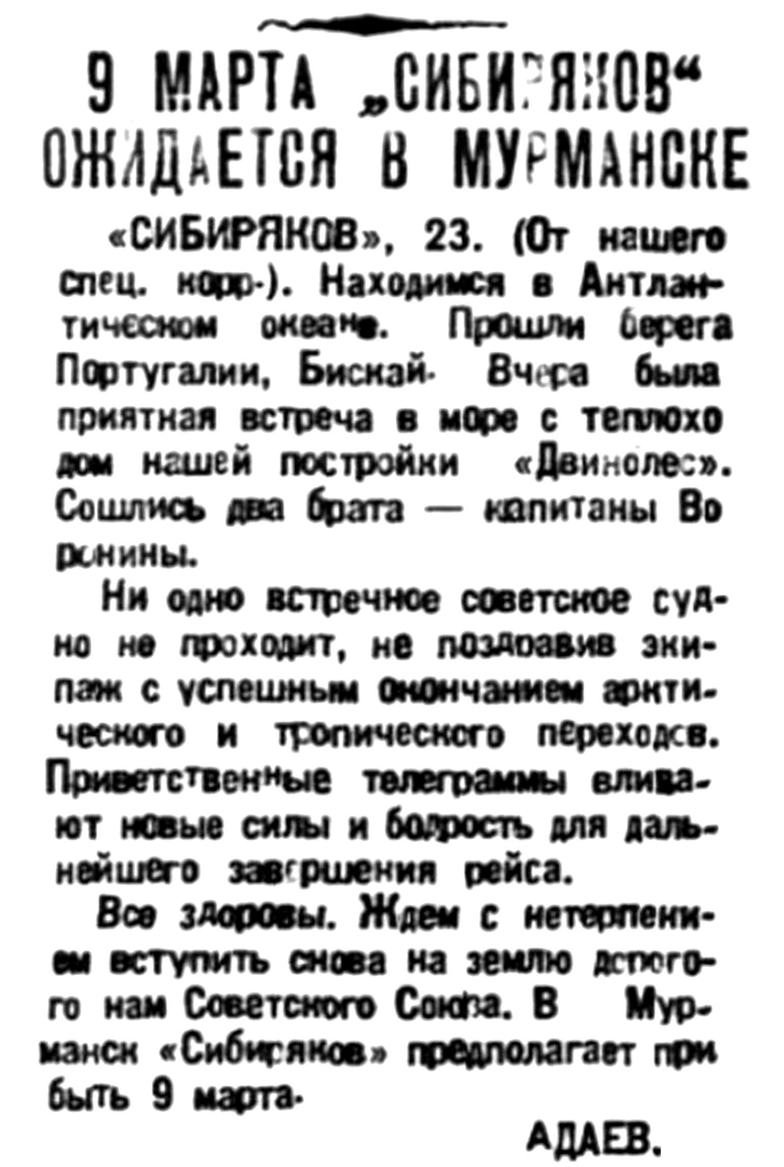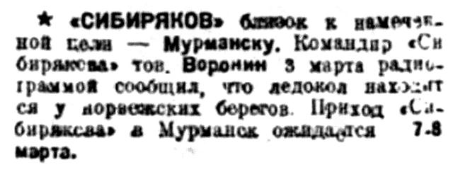 «СИБИРЯКОВ» близок к намеченной цели — Мурманску. Командир "Сибирякова" тов. Воронин 3 марта радиограммой сообщил, что ледокол находится у норвежских берегов. Приход "Сибирякова" в Мурманск ожидается 7-8 марта.
