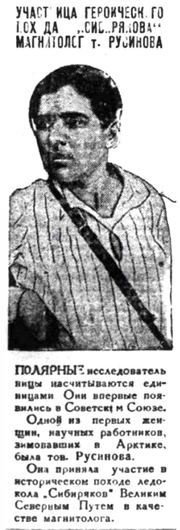 Одной из первых женщин, научных работников, эимовавших в Арктике, была тов. Русинова.