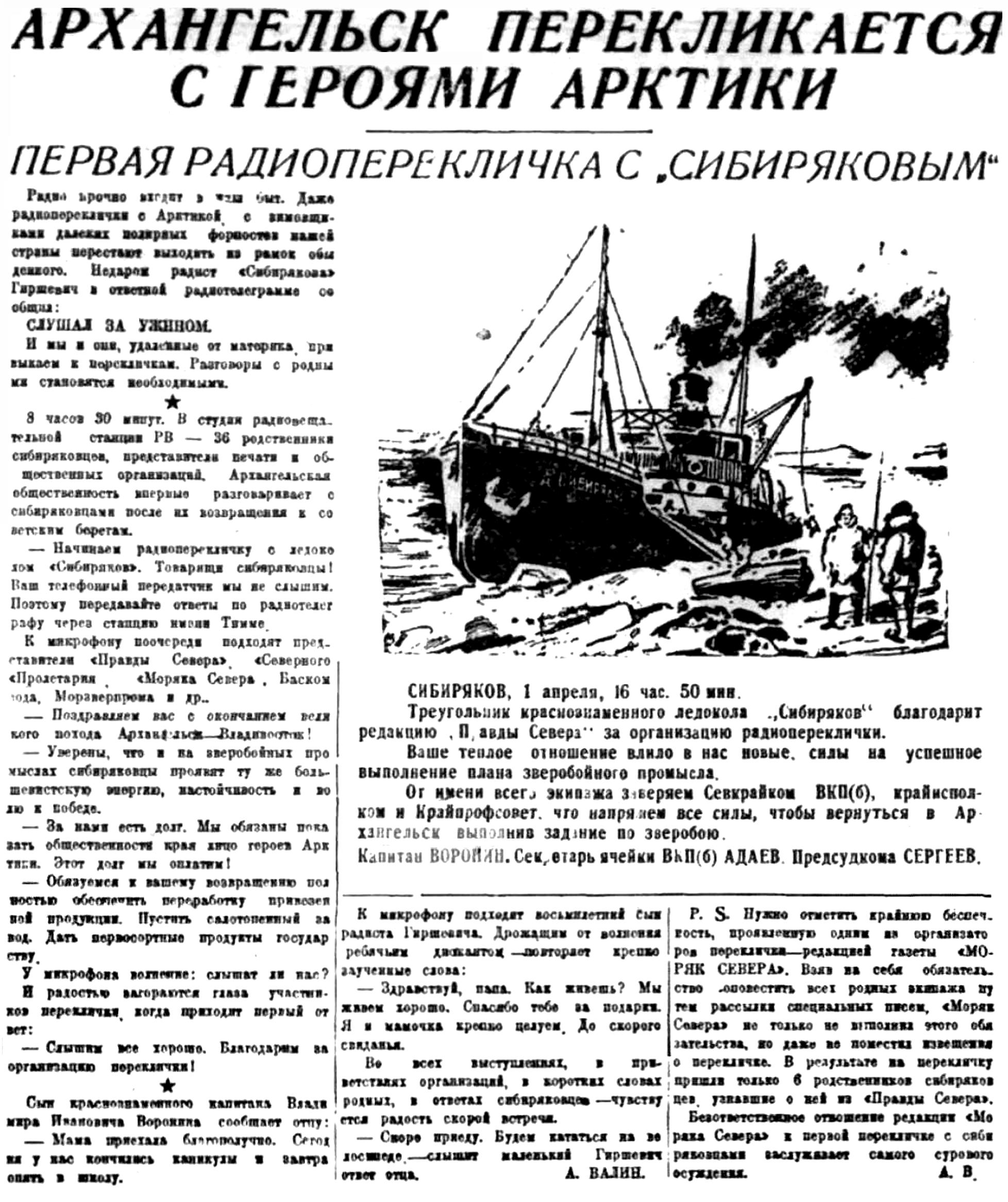 От имени всего экипажа заверяем Севкрайком ВКП(б), крайисполком и Крайпрофсовет, что напряжем все силы, чтобы вернуться в Архангельск выполнив задание по зверобою.