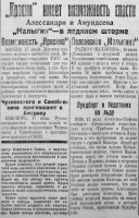 ЛЕДОКОЛ «КРАСИН». Вечером 4 июля выяснилось, что льдом обломана одна лопасть левого винта, Остаемся на месте, где встали 3-го июля, едва заметно дрейфуя вместе со льдом. За ночь подвинулись на 50 саженей. Началась работа водолаза. Возможно, что вынужденное стояние будет использовано для замены обломанной лопасти винта новой. Ледокол по прежнему окружают льды, изборожденные торосами и полыньями.