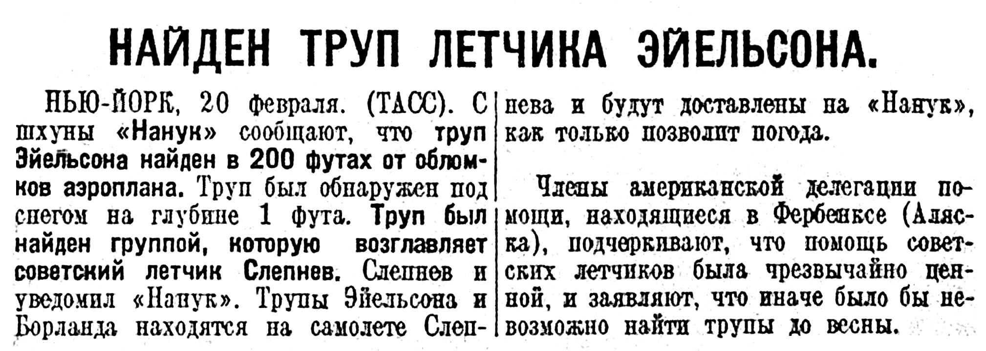 НЬЮ-ЙОРК, 20 февраля. (ТАСС). С шхуны «Нанук» сообщают, что труп Эйельсона найден в 200 футах от обломков аэроплана. Труп был обнаружен под снегом на глубине 1 фута. Труп был найден группой, которую возглавляет советский летчик Слепнев. Слепнев и уведомил «Нанук». Трупы Эйельсона и Борланда находятся на самолете Слепнева и будут доставлены на «Нанук», как только позволит погода.