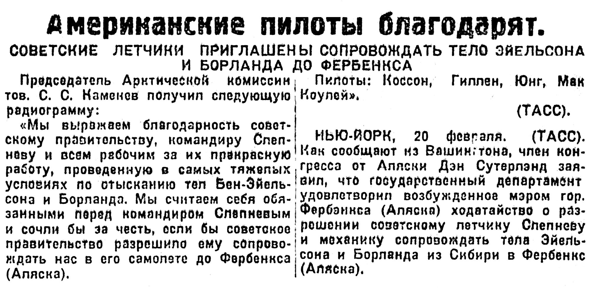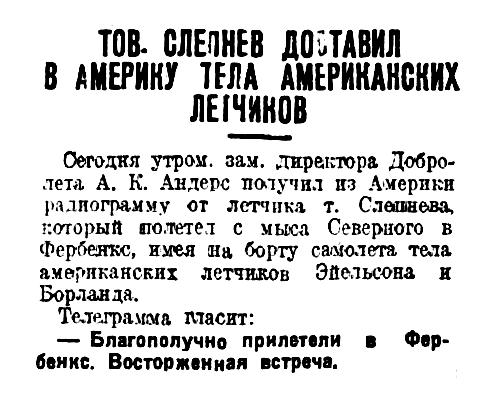 Сегодня утром, зам. директора Добролета А. К. Андерс получил из Америки радиограмму от летчика т. Слепнева, который полетел с мыса Северного в Фербенкс, имея на борту самолета тела американских летчиков Эйельсона и Борланда.