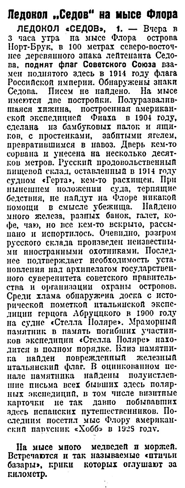 Красная звезда, 1929, № 175Ледокол „Седов" на мысе Флора ЛЕДОКОЛ «СЕДОВ», 1. — Вчера в 3 часа утра на мысе Флора острова Норт-Брук, в 100 метрах северо-восточнее деревянного знака лейтенанта Седова, поднят флаг Советского Союза взамен поднятого здесь в 1914 году флага Российской империи. Обнаружены знаки Седова. Писем не найдено. На мысе имеются две постройки. Полуразвалившаяся хижина, построенная американской экспедицией Фиала в 1904 году, сделана из бамбуковых палок и ящиков, с простенками, забитыми ягелем, превратившимся в навоз. Дверь кем-то сорвана и унесена на несколько десятков метров. Русский продовольственный пищевой склад, оставленный в 1914 году судном «Герта», кем-то расхищен. При нынешнем положении суда, терпящие бедствия, не найдут на Флоре никакой помощи в смысле убежища. Найдено много железа, разных банок, галет, кофе, чаю, но все кем-то вскрыто, рассыпано и испортилось. Очевидно, разгром русского склада произведен неизвестными иностранными охотниками. Последнее подтверждает необходимость установления над архипелагом государственного суверенитета советского правительства и организации охраны островов. Среди хлама обнаружена доска с исторической пометкой итальянской экспедиции герцога Абруццкого в 1900 году на судне «Стелла Поляре». Мраморный памятник в память погибших участников экспедиции «Стелла Поляре» находится в полном порядке. Близ памятника найден поврежденный железный итальянский флаг. В оцинкованном пенале памятника найдены полуистлевшие письма всех бывших здесь полярных экспедиций, в том числе визитные карточки не так давно побывавших здесь испанских путешественников. Последним посетил мыс Флору американский парусник «Хобб» в 1925 году.