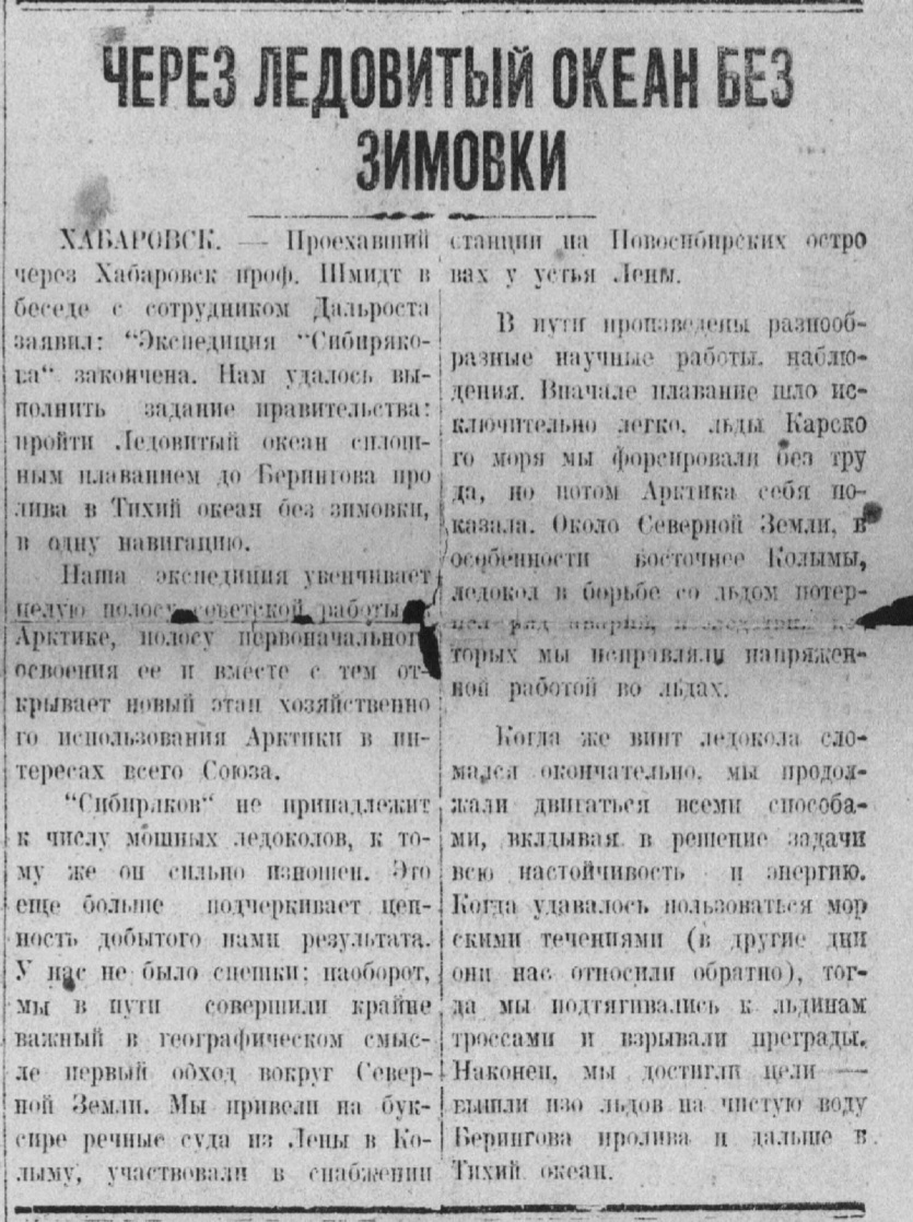 Через Ледовитый океан без зимовки// Рассвет, 3января 1933 г.