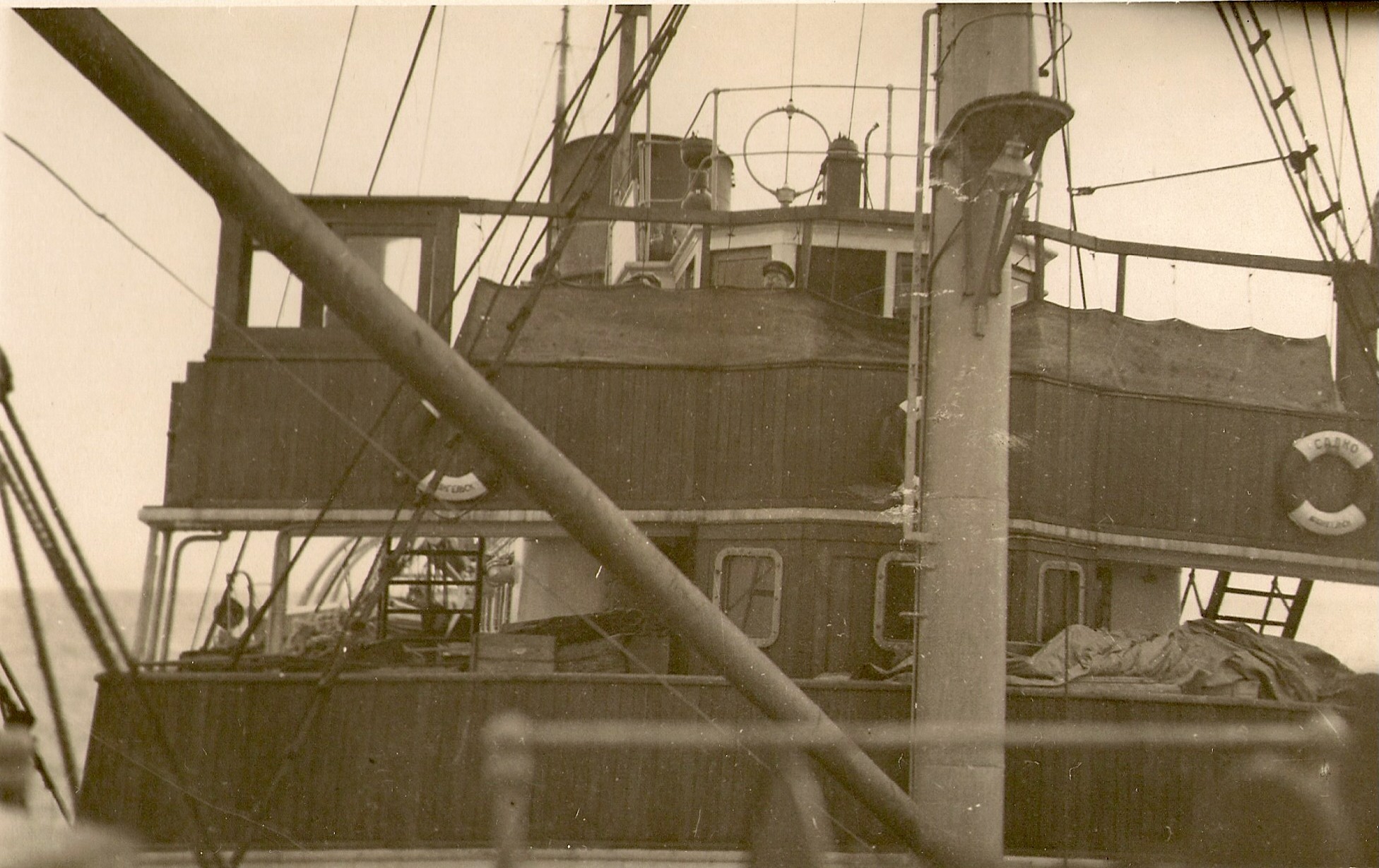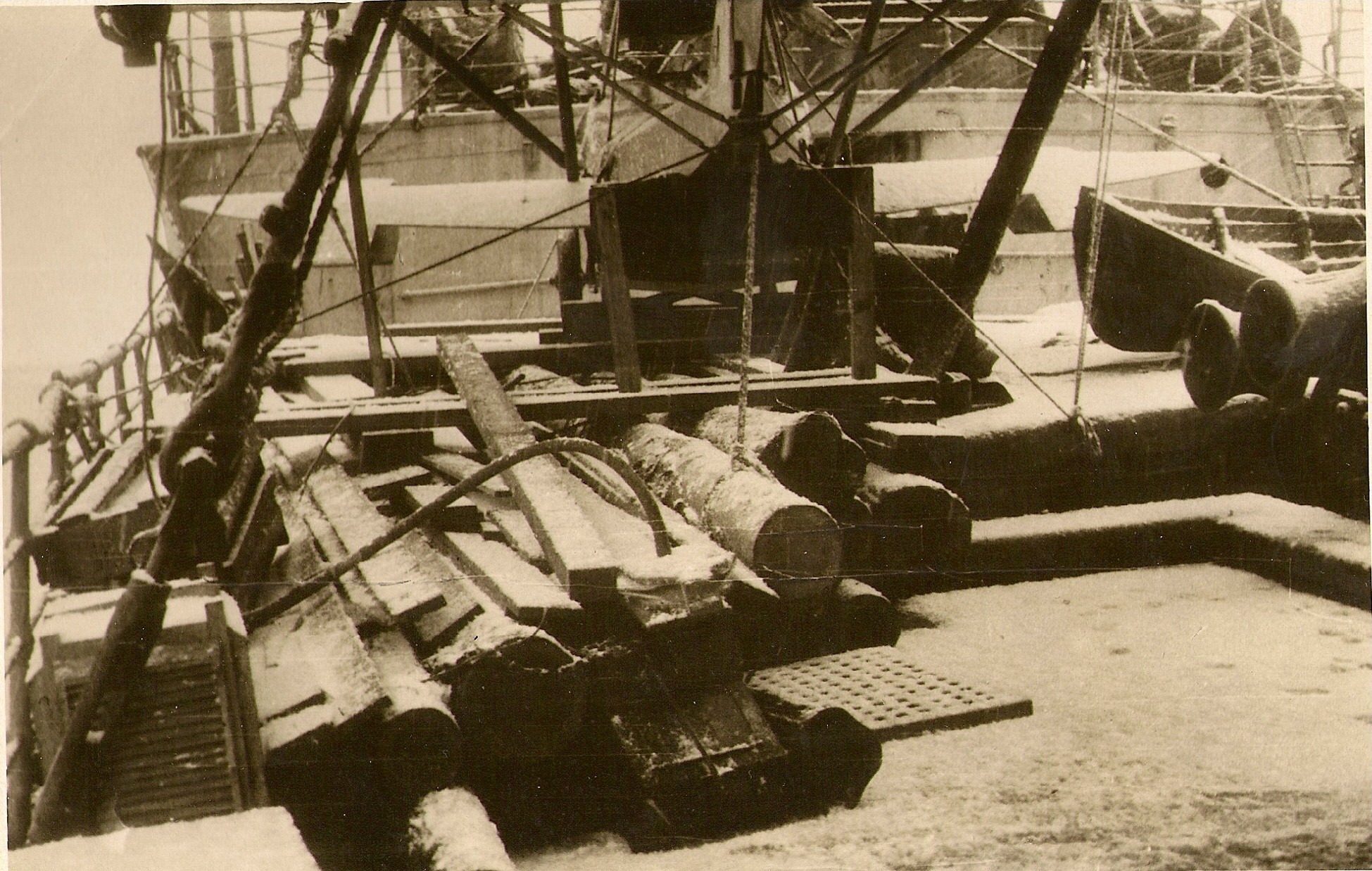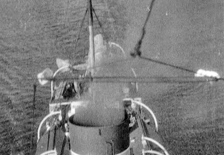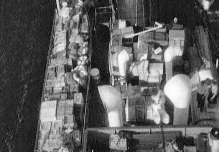 Кадры из обрывков хроники. Садко с марса мачты. От юта к баку. Все палуба заставлена бочками и ящиками.