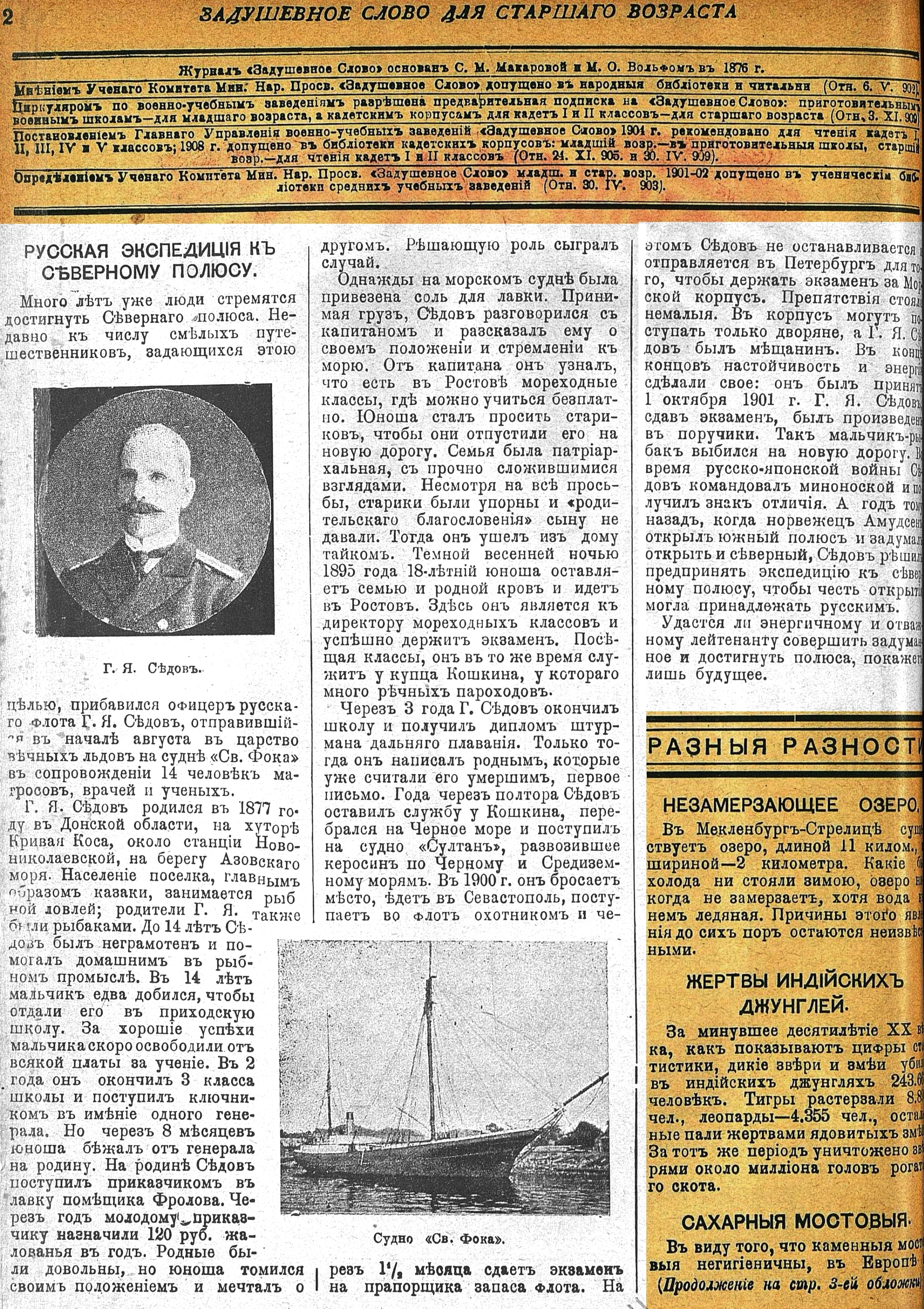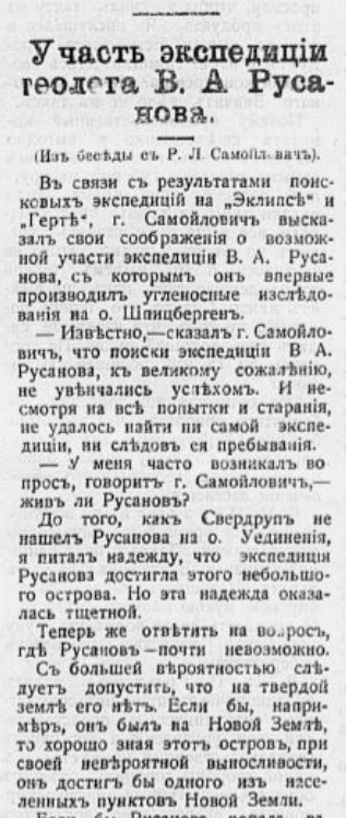 Если судно будет располагать временем, то прошу привести в жилой вид большой рубленый дом. Если судно может располагать лишней шлюпкой, человек на 8 – 10, то прошу таковую оставить на Сара Flora на всякий случай. Все здоровы, все благополучно. Привет. Ст. лет. Седов.