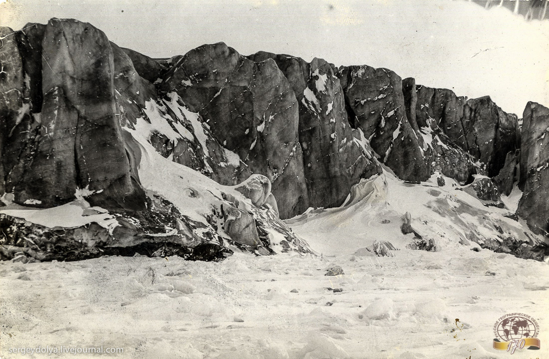 Сегодня все празднуем. Тихая бухта нас вполне скрыла от непогоды. Встал сегодня, откачали воду, было ее за ночь 16 дюймов. В 10 ч. отслужили обеденку. Все стояли на молитве с большим благоговением. Затем был прочитан мой приказ о постановке экспедиции на зимовку. С большим волнением слушали его все, и я сам волновался. Даже я сказал маленькое слово команде и поздравил всех с праздником. За обедом была, уже давно невиданная, белая скатерть, рюмка водки и жареная моржатина, которую с удовольствием все едят, а у нас ее 300 пудов. Жить можно. В кают-компании сегодня впервые затопили норвежскую печку дровами и ворванью, жара страшная. WNW все еще упорно дует при 5-6о мороза. Лед в Британском канале сгустился, его этим ветром напирает с моря. Нас окружают высокие с террасами горы пирамидальной формы, мы, таким образом, защищены от ветра. Породы здесь главным образом базальты Юрской эпохи. Бухта тихая, вероятно очень глубокая с крутым рельефом дна, резко обрывающимся у самого берега в большую глубину. По бухте плавают величественные айсберги, местных ледников, она закрыта от всех ветров и волнений, а также и ото льдов, за то ее назвали мы тихой. Здесь так тихо, так хорошо и спокойно, как у Веруни под крылышком.