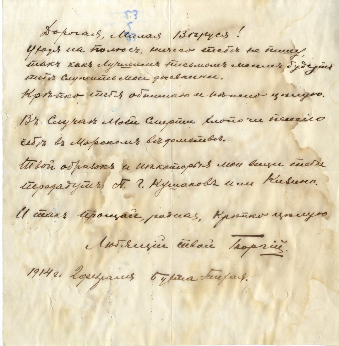 Так умереть хорошо! Где-то ты теперь, моя славная, дорогая Верошка? Что стой и как себя чувствуешь? Страстно хочу в настоящую минуту хоть что-нибудь знать о тебе. Явись мне, Ангел мой, во сне и успокой твоего полудикого, но все еще сильно тебя любящего Георгия. Свято целую твои милые уста и склоняюсь на твою белую грудь и в счастье засыпаю. По-ко-й-ной – но – чи, Ве – ру – ня! …..