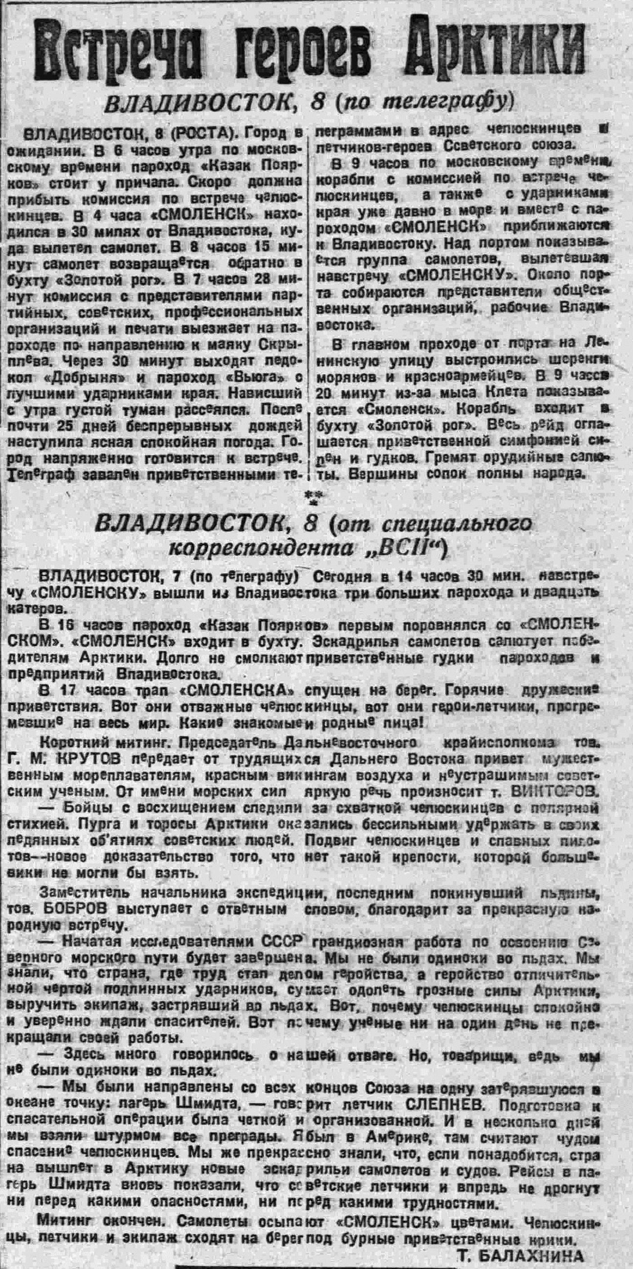 ВЛАДИВОСТОК, в (РОСТА). Город в ожидании. В 6 часов утра по московскому времени пароход «Казак Поярков» стоит у причала. Скоро должна прибыть комиссия по встрече челюскинцев. В 4 часа «СМОЛЕНСК» находился в 30 милях от Владивостока, куда вылетел самолет. В 8 часов 15 минут самолет возвращается обратно в бухту «Золотой рог». В 7 часов 28 минут комиссия с представителями партийных. советских, профессиональных организаций и печати выезжает на пароходе по направлению к маяку Скрыплева. Через 30 минут выходят ледокол «Добрыня» и пароход «Вьюга» с лучшими ударниками края. Нависший с утра густой туман рассеялся. После почти 25 дней беспрерывных дождей наступила ясная спокойная погода. Город напряженно готовится к встрече. Телеграф завален приветственными телеграммами в адрес челюскинцев в летчиков - героев Советского союза.