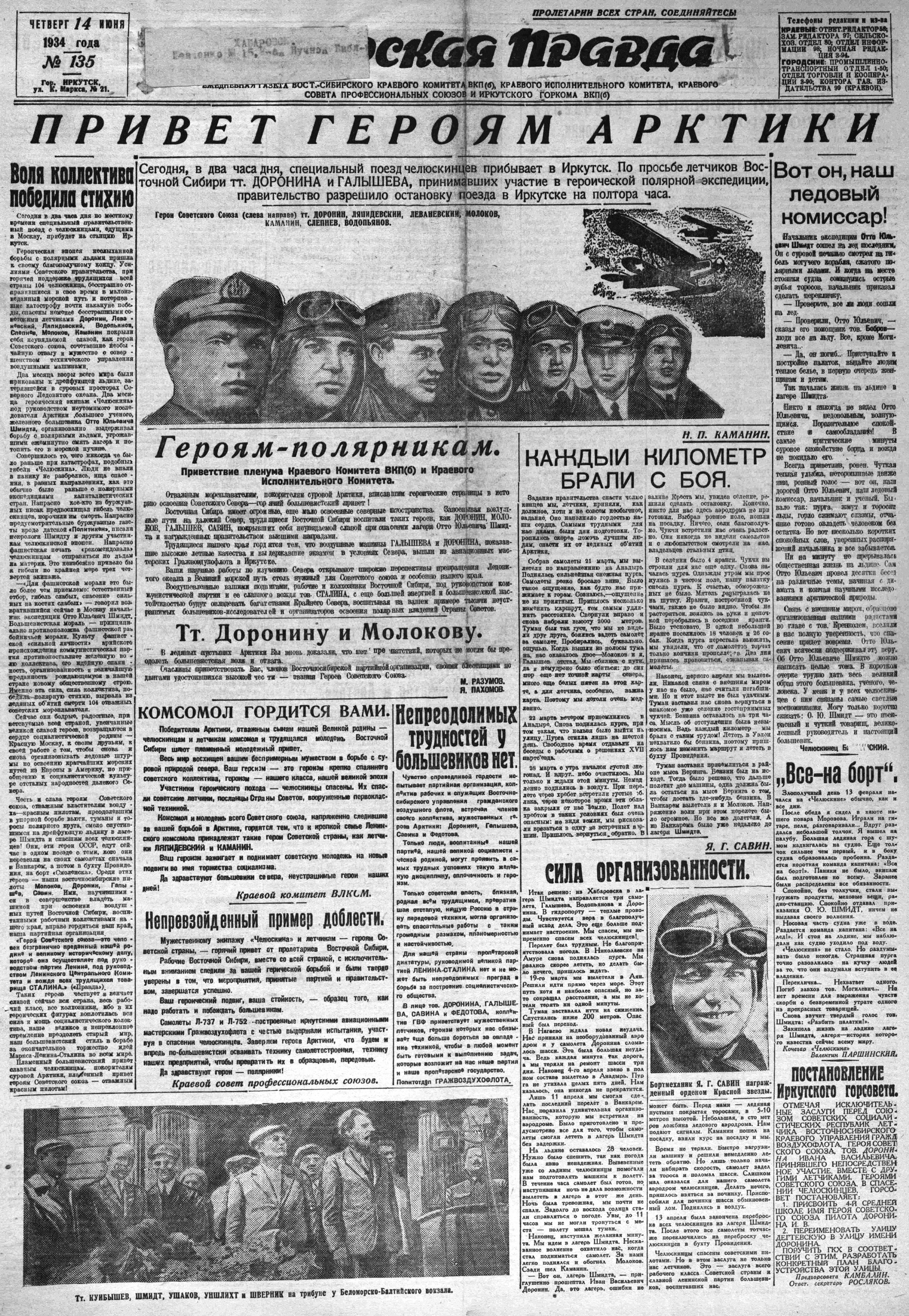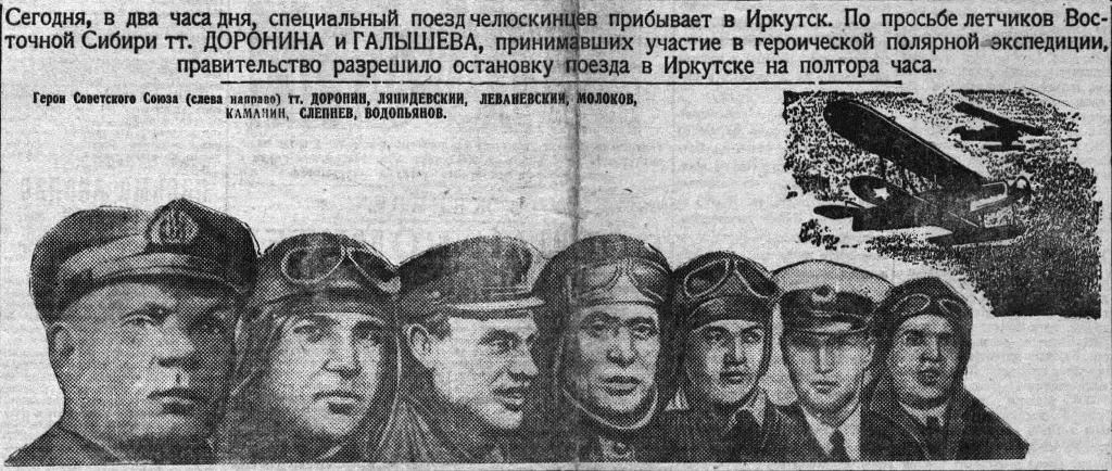Сегодня, в два часа дня, специальный поезд челюскинца прибывает в Иркутск. По просьбе летчиков Восточной Сибири тт. ДОРОНИНА и ГАЛЫШЕВА, принимавших участие в героической полярной экспедиции, правительство разрешило остановку поезда в Иркутске на полтора часа.