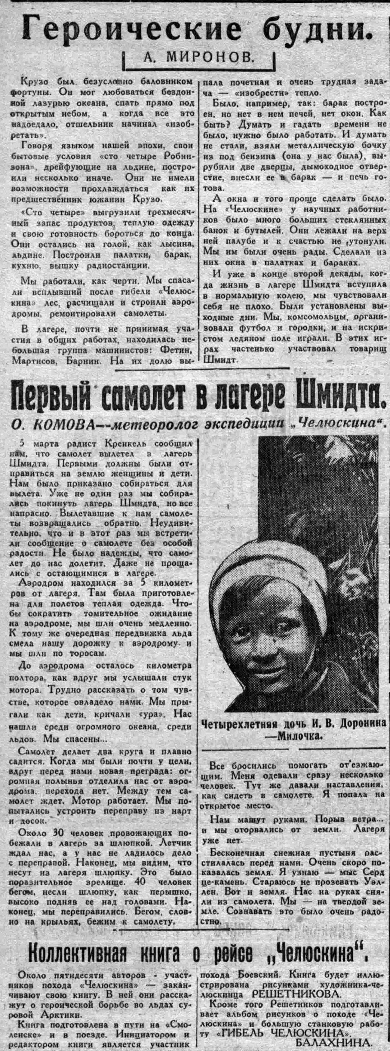 5 марта радист Кренкель сообщил нам, что самолет вылетел в лагерь Шмидта. Первыми должны были отправиться на землю женщины и дети. Нам было приказано собираться для вылета. Уже не один раз мы собиралась покинуть лагерь Шмидта, но все напрасно. Вылетавшие к нам самолеты возвращались обратно. Неудивительно, что и в этот раз мы встретили сообщение о самолете без особой радости. Не было надежды, что самолет до нас долетит. Даже не прощались с остающимися в лагере.