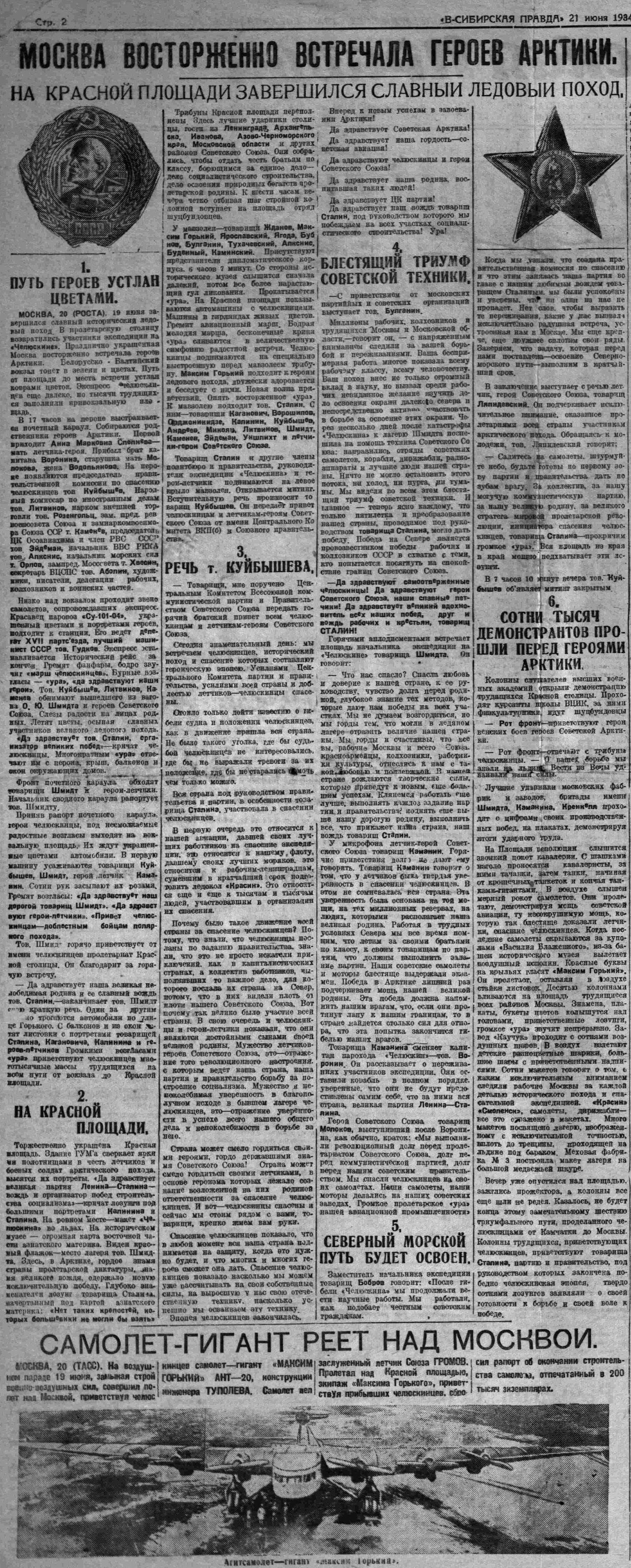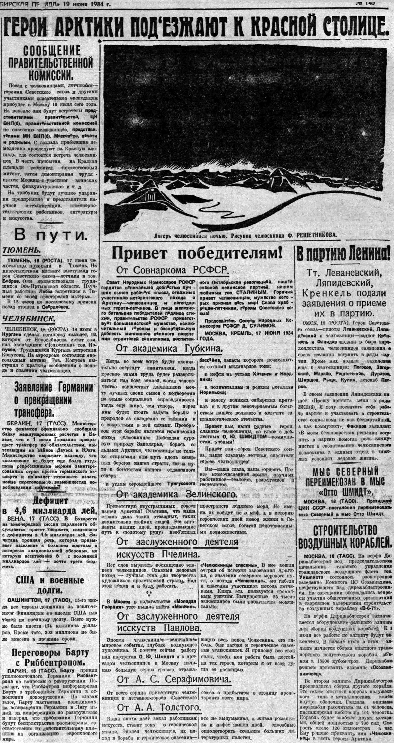 Поезд с челюскинцами, летчиками — героями Советского союза и другими участниками спасательной экспедиции прибудет в Москву 19 июня сего года. На вокзале они будут встречены представителями правительства, ЦК ВКП(б), правительственной комиссией по спасению челюскинцев, представителями МК ВКП(б). Моссовета, печати и родными. С вокзала прибывшие немедленно проследуют на Красную площадь, где состоится встреча челюскинцев. В честь прибытия, на Красной площади состоится торжественный митинг, затем демонстрация трудящихся Москвы с участием воинских частей, физкультурников и т. д.