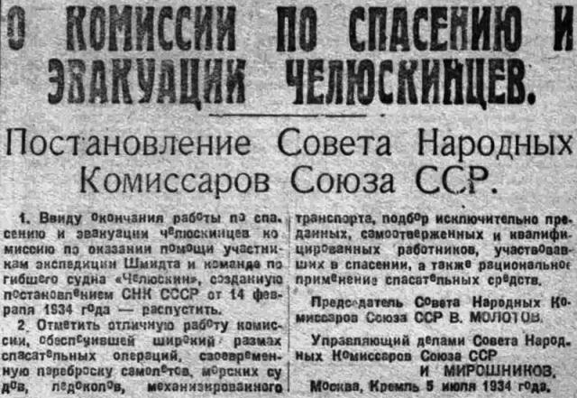 1. Ввиду окончания работы по спасению и эвакуации челюскинцев комиссию по оказании помощи участникам экспедиции Шмидта и команде погибшего судна "Челюскин", созданную постановлением СНК СССР от 14 февраля 1934 года — распустить.