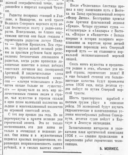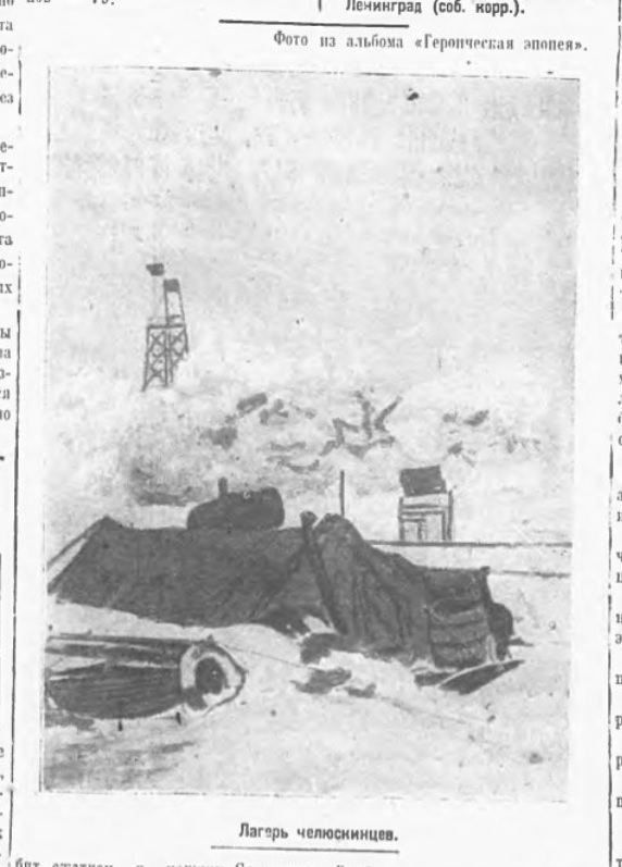 — Бойцы с восхищением следили за схваткой челюскинцев с полярной стихией. Пурга и торосы Арктики оказались бессильными удержать в своих ледяных объятиях советских людей. Подвиг челюскинцев и славных пилотов — новое доказательство того, что нет такой крепости, которой большевики не могли бы взять.