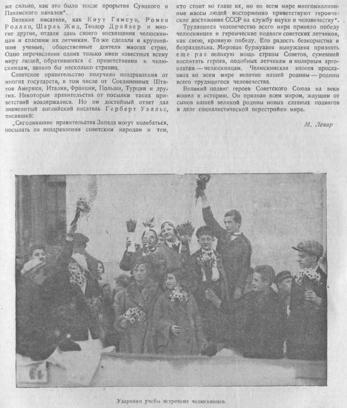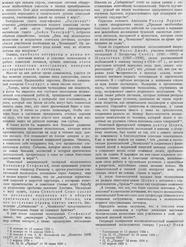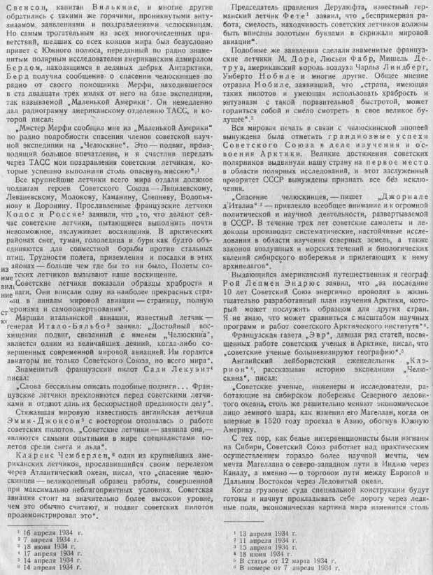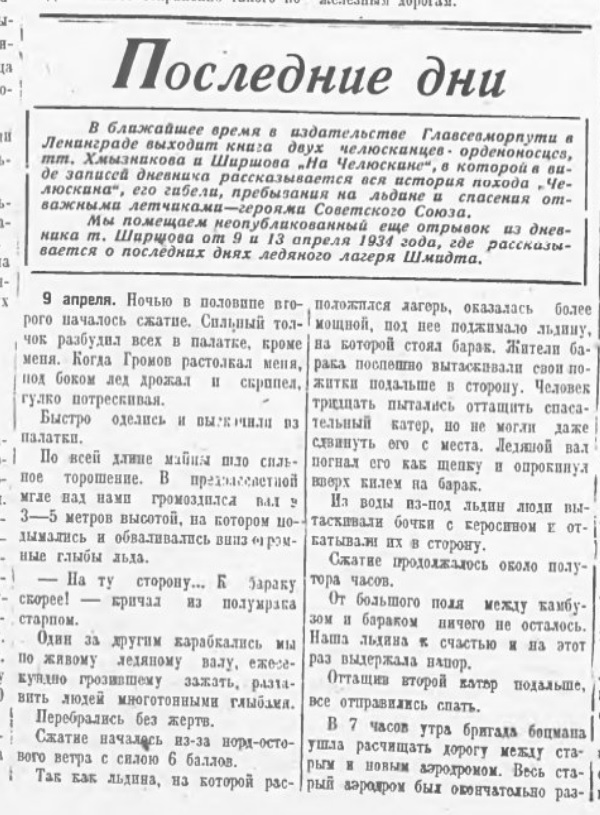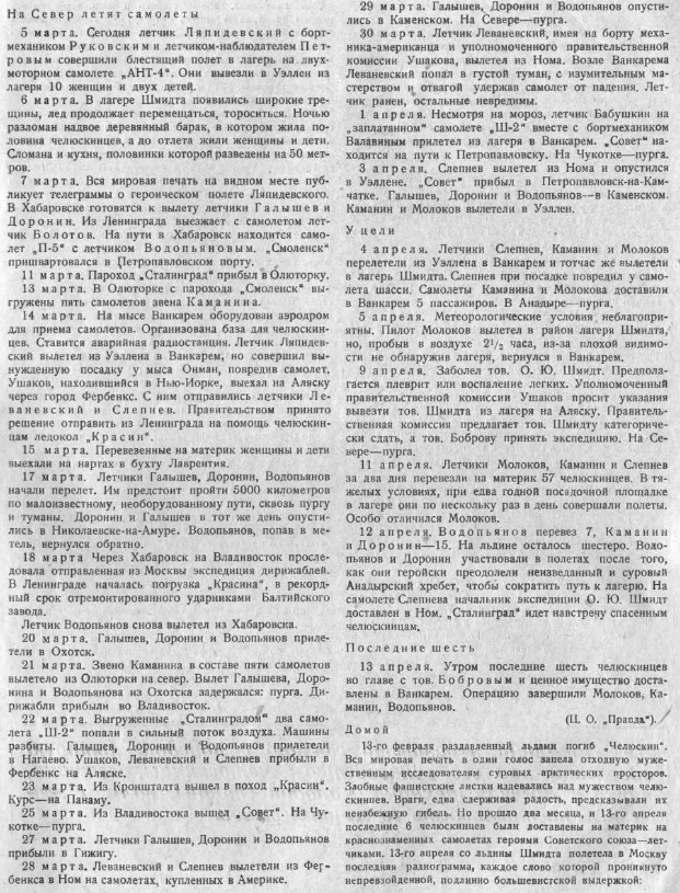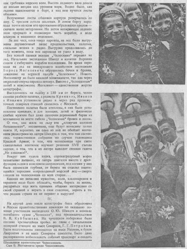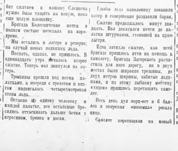 — Мы были направлены со всех концов Союза на одну затерявшуюся в океане точку: лагерь Шмидта, — говорит летчик СЛЕПНЕВ. Подготовка и спасательной операции была четкой и организованной. И в несколько дней мы взяли штурмом все преграды. Я был в Америке, там считают чудом спасение челюскинцев. Мы же прекрасно знали, что, если понадобится, страна вышлет в Арктику новые эскадрильи самолетов и судов. Рейса в лагерь Шмидта вновь показали, что советские летчики и впредь не дрогнут ни перед какими опасностями, ни перед какими трудностями.