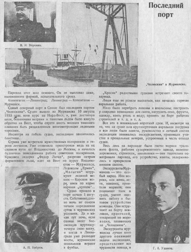 В 17 часов трап «СМОЛЕНСКА» спущен на берег. Горячие дружеские приветствия. Вот они отважные челюскинцы, вот они герои-летчики, прогремевшие на весь мир. Какие знакомые и родные лица!