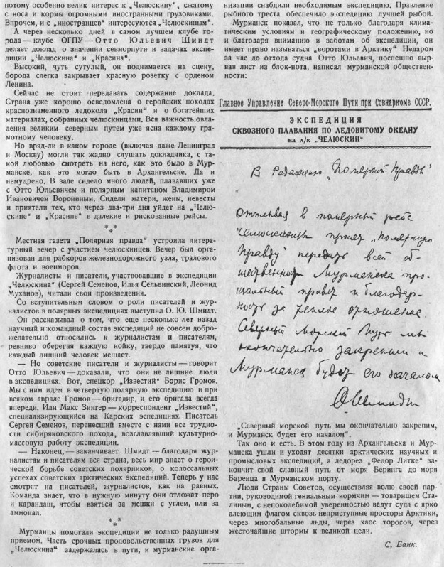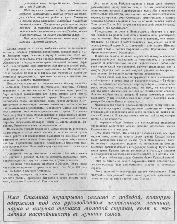 — Начатая исследователями СССР грандиозная работа по освоению Северного морского пути будет завершена. Мы не были одиноки во льдах. Мы знали, что страна, где труд стал делом геройства, а геройство отличительной чертой подлинных ударников, сумеет одолеть грозные силы Арктики, выручить экипаж, застрявший во льдах. Вот, почему челюскинцы спокойно и уверенно ждали спасителей. Вот почему ученые ни на один день не прекращали своей работы.