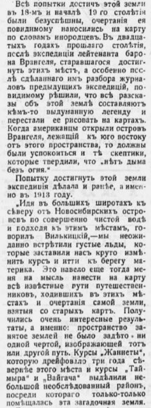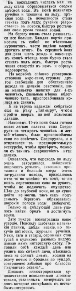 Радіотелеграфъ. Около этого времени судно «Эклипсъ»г снаряженное Главнымъ Гидрографическимъ Унравленіемъ для поисковъ пропавшихъ экспедицій геолога Русанова и лейте-нанта Брусилова и зазимовавшее у мыса Штеллинга, начало перехватывать телеграммы изъ Норвегіи на Шпицбергенъ и изъ Архангельска на Югорскій шаръ и время отъ времени сообщать на «Таймыръ» нѣкоторыя свѣдѣнія о ходѣ войны. Командиръ «Эклипса», капитанъ Свердрупъ, увеличивъ мощность своей радіостанціи устройствомъ высокой мачты на льду, добился радіотелеграфной связи со станціей «Югорскій шаръ», результатомъ чего явилась возможность въ январѣ обмѣняться служебными телеграммами между Управленіемъ и судномъ «Таймыръ».