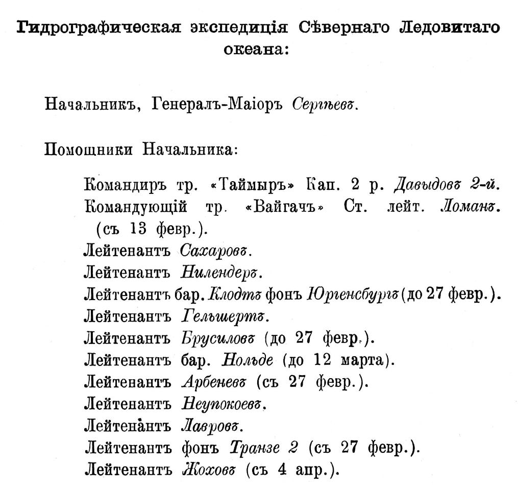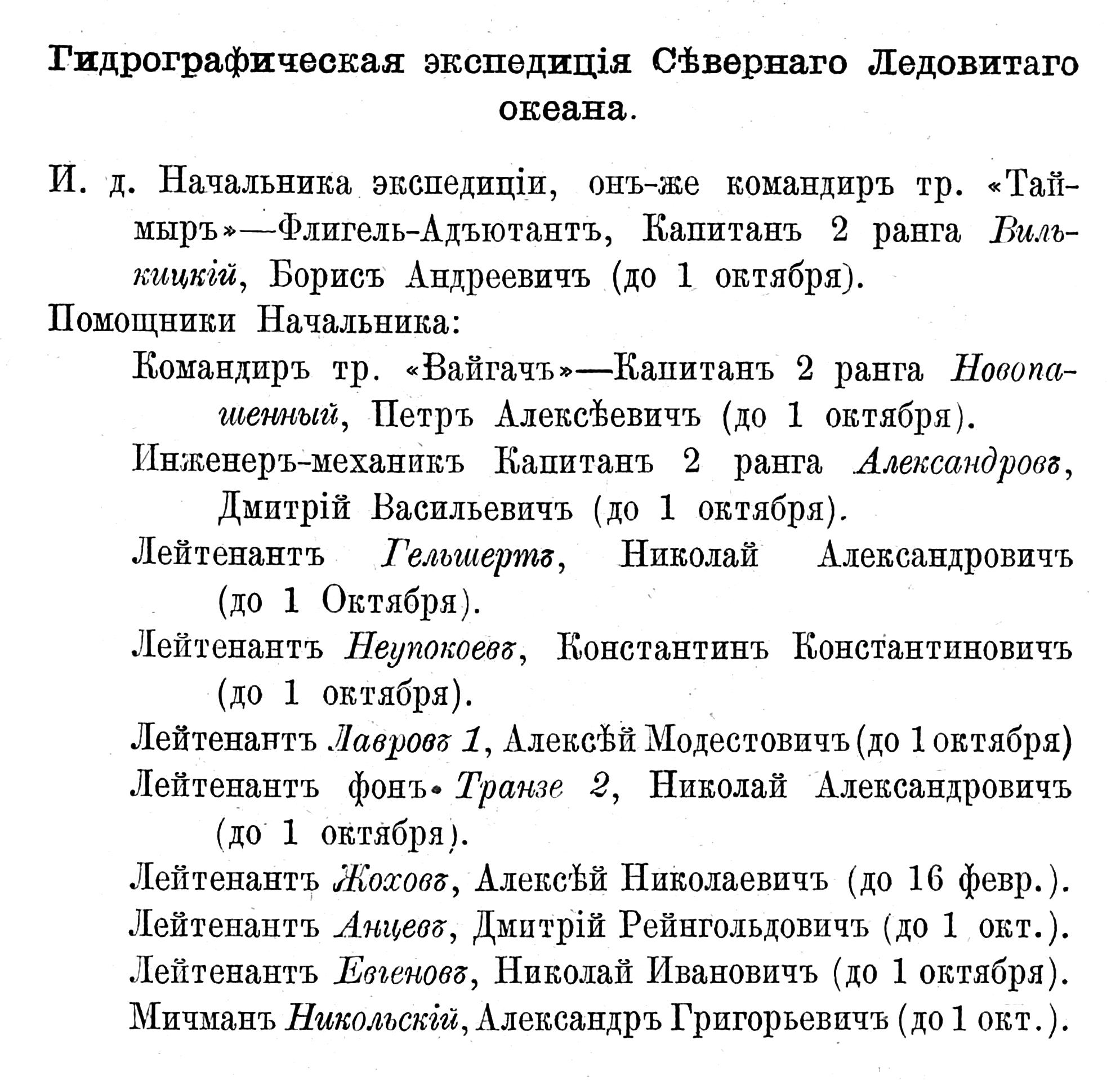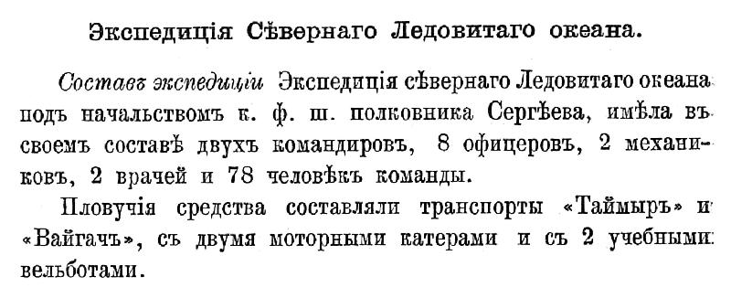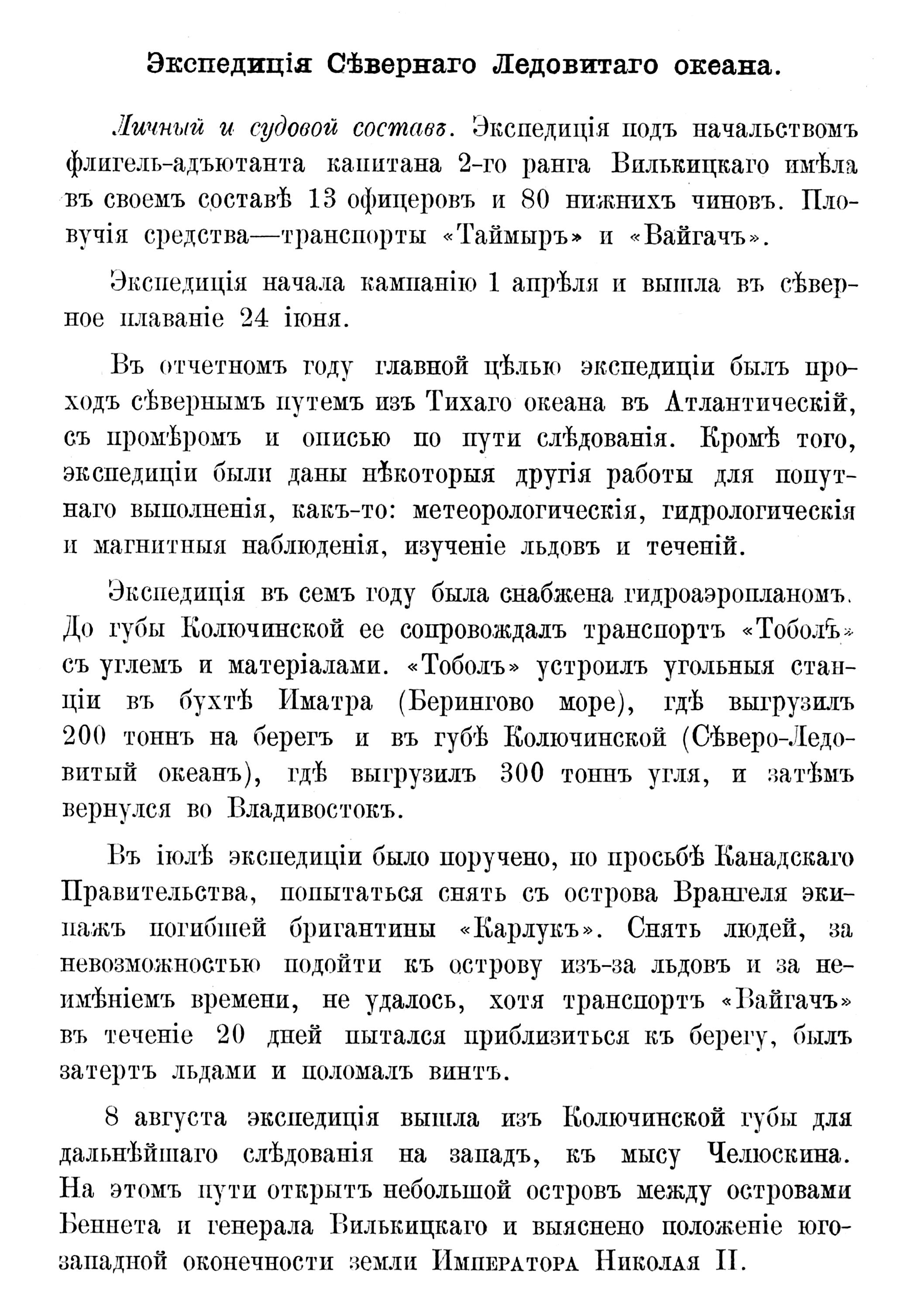 Гидрографическая Экспедиція Сѣвернаго Ледовитаго океана.Личный и судовой составъ. Экспедиція подъ начальствомъ флигель-адъютанта капитана 2-го ранга Вилькицкаго, имѣя въ своемъ составѣ 13 офицеровъ и 80 нижнихъ чиновъ совершила свое плаваніе на гидрографическихъ судахъ «Таймыръ» и «Вайгачъ».