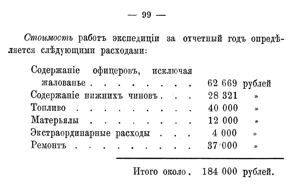 Состояніе здоровья личнаго состава. Здоровье офицеровъ и команды было удовлетворительно. Довольно часто случались незначительныя обмороженія, а одинъ разъ матросъ 1 ст. Андрей Попковъ настолько сильно отморозилъ лѣвую руку, что потребовалась ампутація трехъ пальцевъ и части четвертаго. Въ нѣсколькихъ случаяхъ наблюдался, особенно за время полярной ночи, упадокъ питанія, повышенное нервное состояніе, а на «Вайгачѣ» обнаружено было нѣсколько заболѣваній цингой, къ счастью въ легкой формѣ.