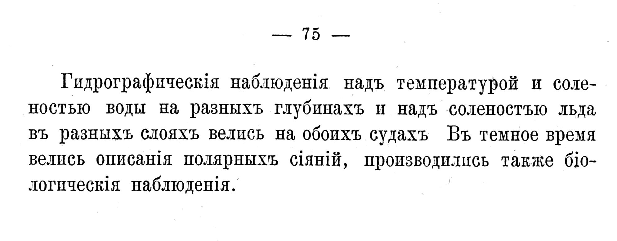 Гидрографыческія наблюденія надъ температурой и соленостью воды на разныхъ глубинахъ и надъ соленостъю льда въ разныхъ слояхъ велись на обоихъ судахъ. Въ темное время велись описанія полярныхъ сіяній, производились также біологическія наблюденія.