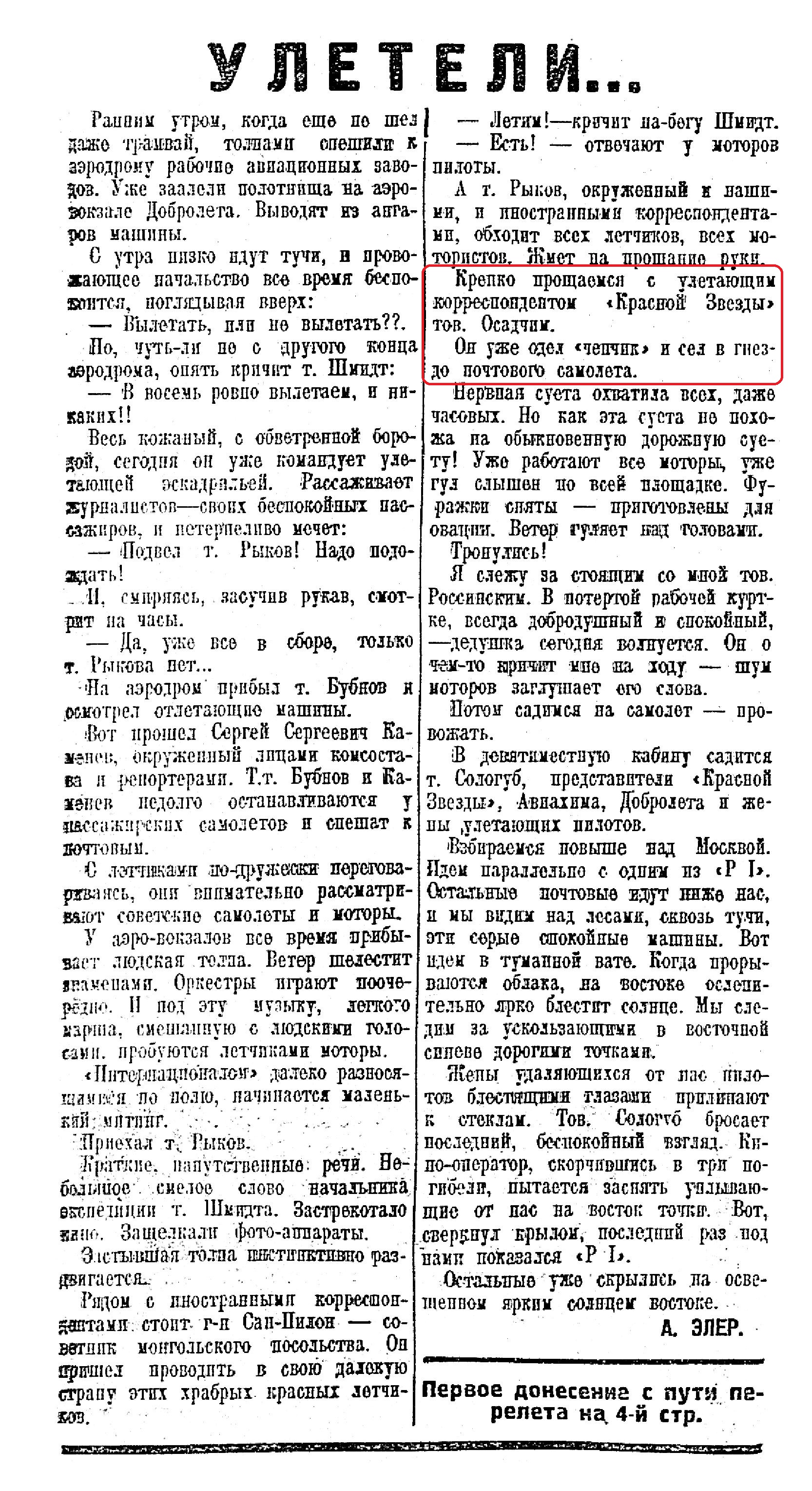 История полета пополняется. Среди журналистов, которые летели с экспедицией фигурировал некто Осадчий, который представлял военные газеты. Нам удалось выяснить, кто это был. Осадчий (Осадший) Александр Маркович. https://ria1914.info/index.php?title=%D ... 0%B8%D1%87