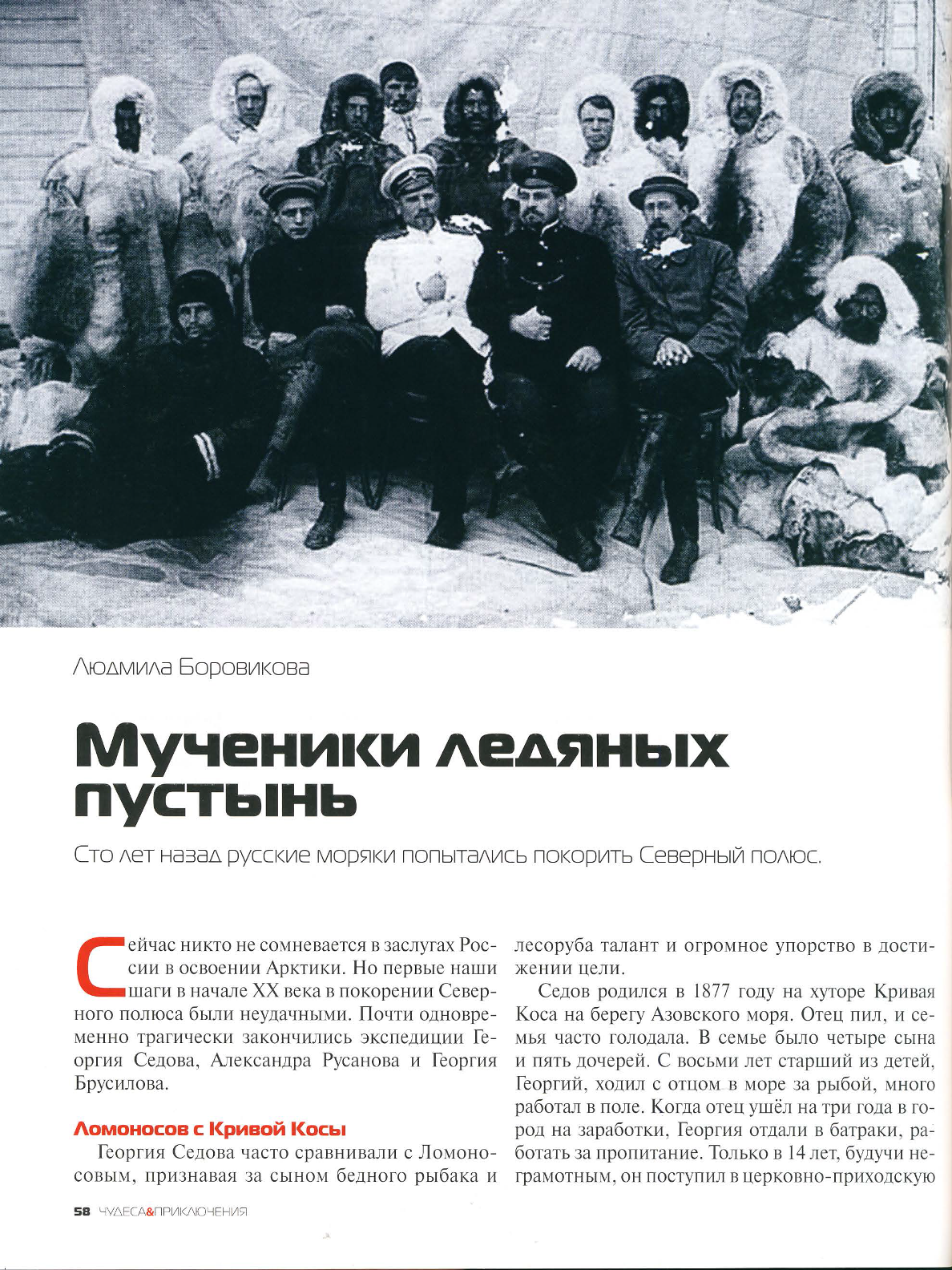 Боровикова Л. Мученики ледяных пустынь : сто лет назад русские моряки попытались покорить Северный полюс / Людмила Боровикова // Чудеса и приключения. 2012. № 12. С. 58-61