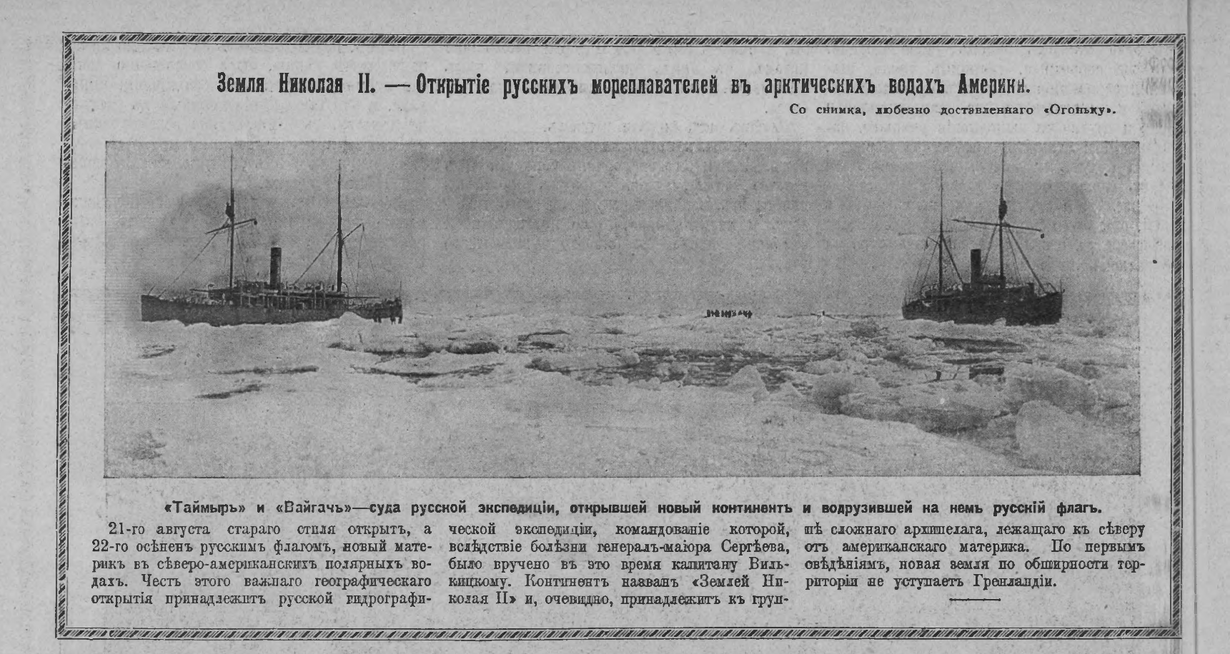 информацию про памятный знак "В ознаменование Гидрографической экспедиция Северного Ледовитого океана" на ледокольных пароходах «Таймыр» и «Вайгач» из Владивостока в Архангельск под руководством капитана 2 ранга Б.А.Вилькицкого. Высочайше утверждён 12.11.1915 и