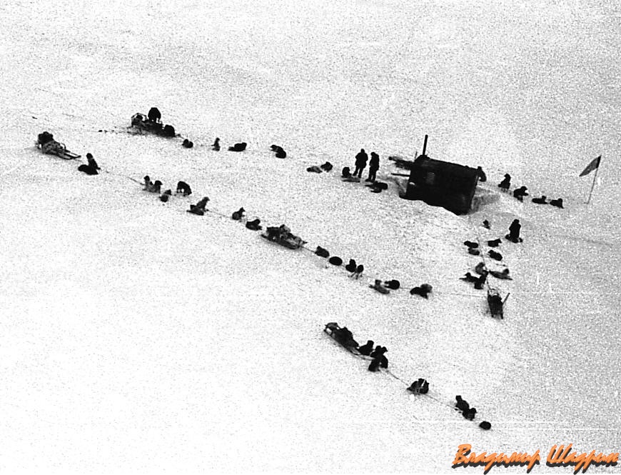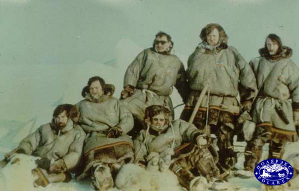 ...В основном составе экспедиции было шесть человек и два вспомогательных отряда по три человека в каждом, которые не участвовали в самом переходе, но поддерживали радиосвязь с основным отрядом и обеспечивали подготовку продовольствия в базовых лагерях экспедиции, разбитых в Уэлене, Чокурдахе, Хатанге, Амдерме и Мурманске. Они, как и члены маршрутного отряда, также прошли двухлетнюю подготовку к этой экспедиции, и выполняли функцию дублёров, готовых, в случае необходимости, заменить кого-либо из участников основного отряда.