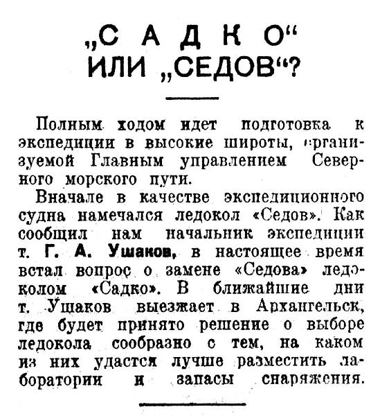 Вначале в качестве экспедиционного судна намечался ледокол «Седов». Как сообщил нам начальник экспедиции т. Г. А. Ушаков, в настоящее время встал вопрос о замене «Седова» ледоколом «Садко». В ближайшие дни т. Ушаков выезжает в Архангельск, где будет принято решение о выборе ледокола сообразно с тем, на каком из них удастся лучше разместить лаборатории н запасы снаряжения.
