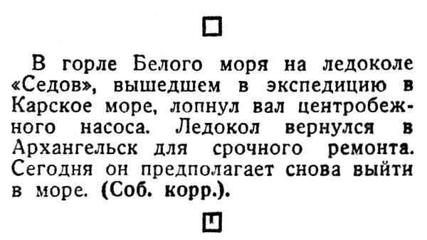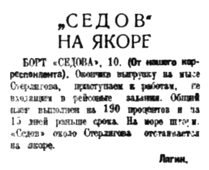 Из Архангельска вышел в Карское море ледокол «Седов». На его борту — строительные рабочие и смена зимовщиков для полярной станции мыса Стерлигова. Экипаж «Седова» построит две новые полярные станции на острове Русском и в устье реки Таймыр. Ледокол ведет старейший капитан Севера тов. Швецов. (Соб. корр.).