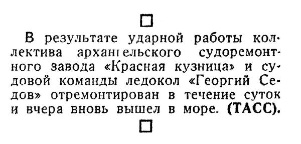 В результате ударной работы коллектива архангельского судоремонтного завода «Красная кузница» и судовой команды ледокол «Георгий Седов» отремонтирован в течение суток и вчера вновь вышел в море. (ТАСС).