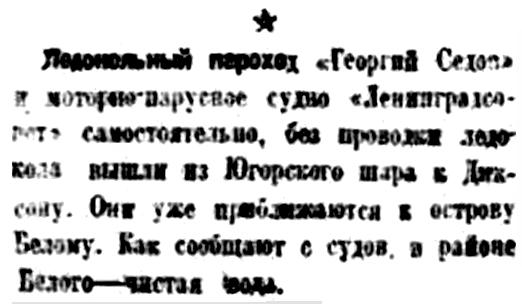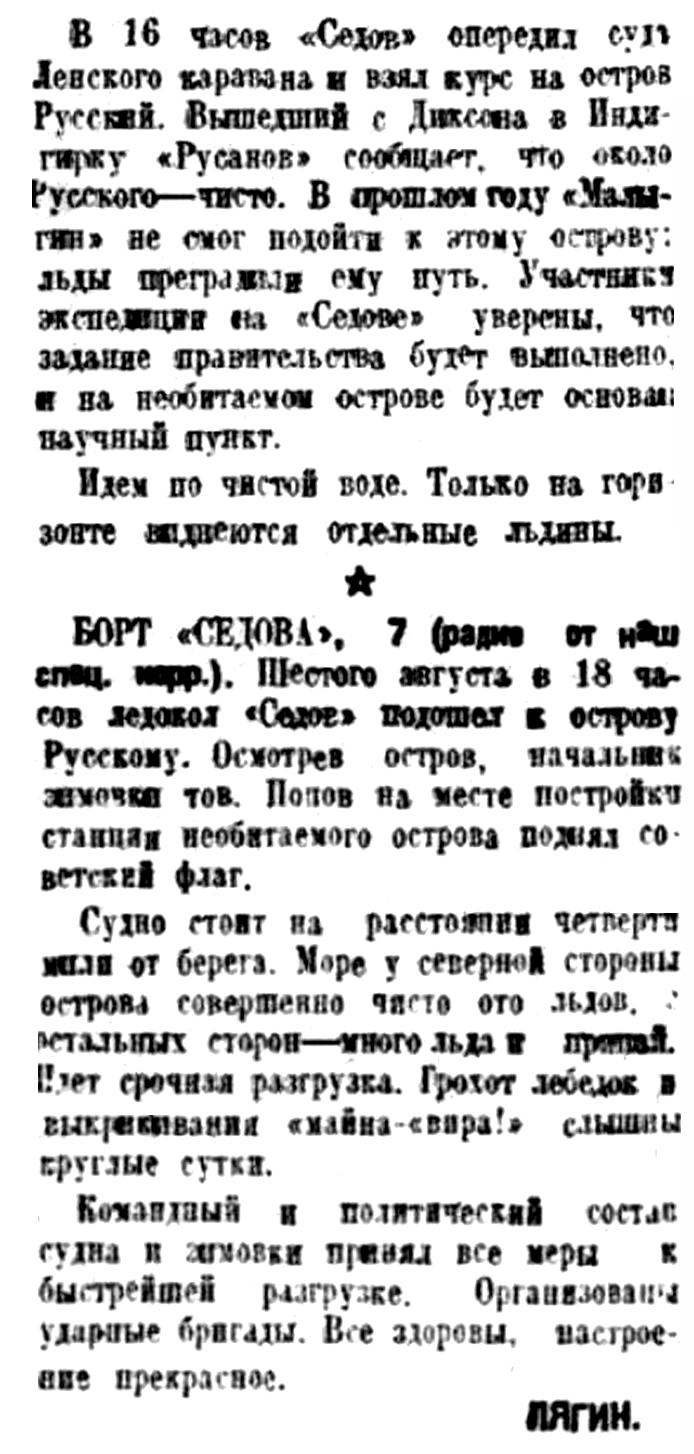 В 16 часов "Седов" опередил суда Ленского каравана и взял курс на остров Русский. Вышедший с Диксона в Индигирку "Русанов" сообщает, что около Русского — чисто. В прошлом году "Малыгин" не смог подойти к этому острову: льды преградили ему путь. Участники экспедиции на "Седове" уверены, что задание правительства будет выполнено, и на необитаемом острове будет основан научный пункт.