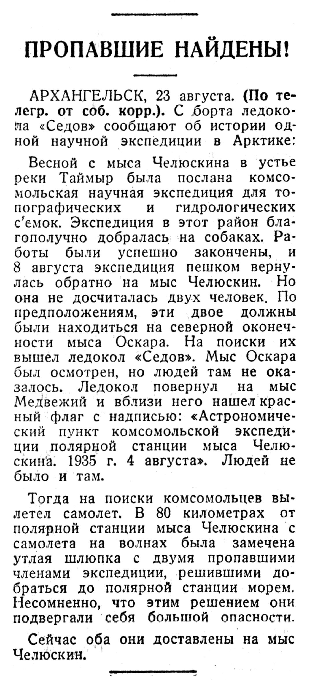 «С мыса Челюскина ушли в научную разведку два комсомольца с упряжкой собак и аппаратурой. Пропали. Не имеем сведений несколько дней. Просим оказать помощь в розыске».
