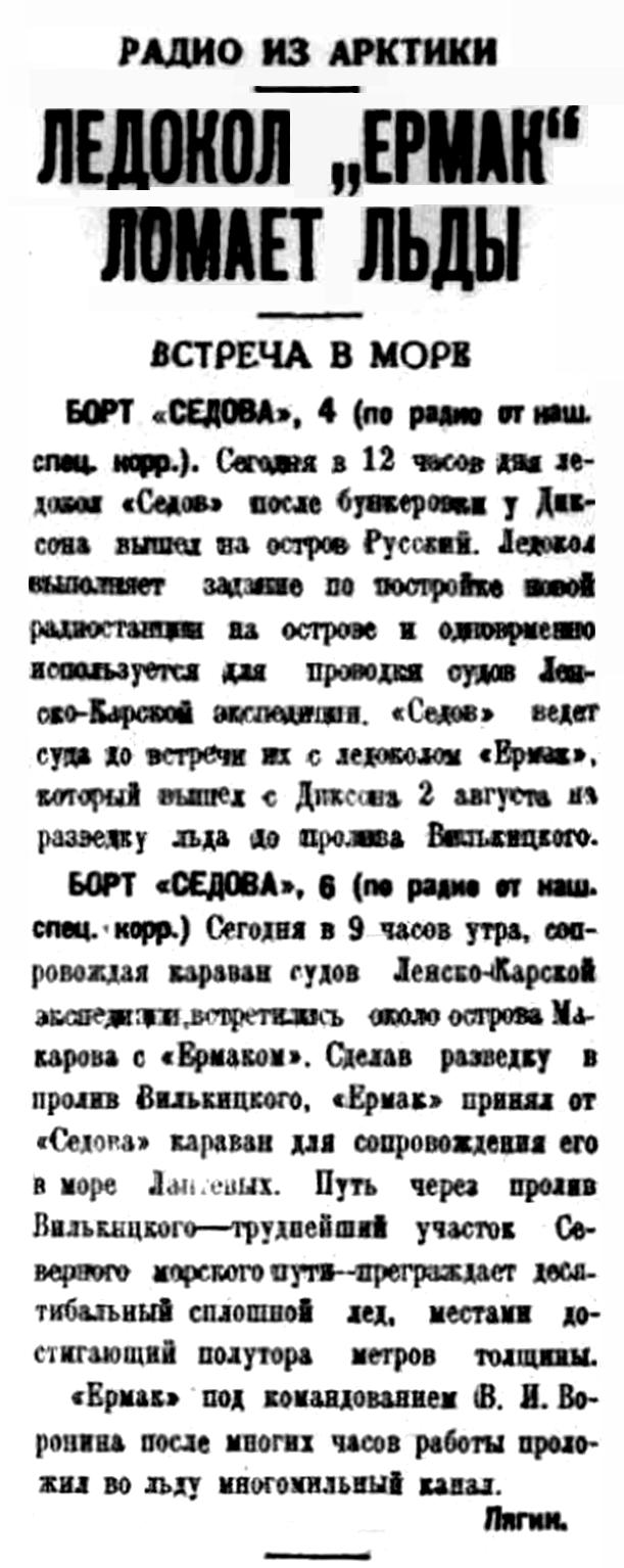 БОРТ "СЕДОВА", 6 (по радио от наш. спец. корр.) Сегодня в 9 часов утра, сопровождая караван судов Ленско-Карской экспедиции, встретились около острова Макарова с "Ермаком". Сделав разведку в пролив Вилькицкого, "Ермак" принял от "Седова" караван для сопровождения его в море Лаптевых. Путь через пролив Вилькицкого — труднейший участок Северного морского пути — преграждает десятибалльный сплошной лед, местами достигающий полутора метров толщины.