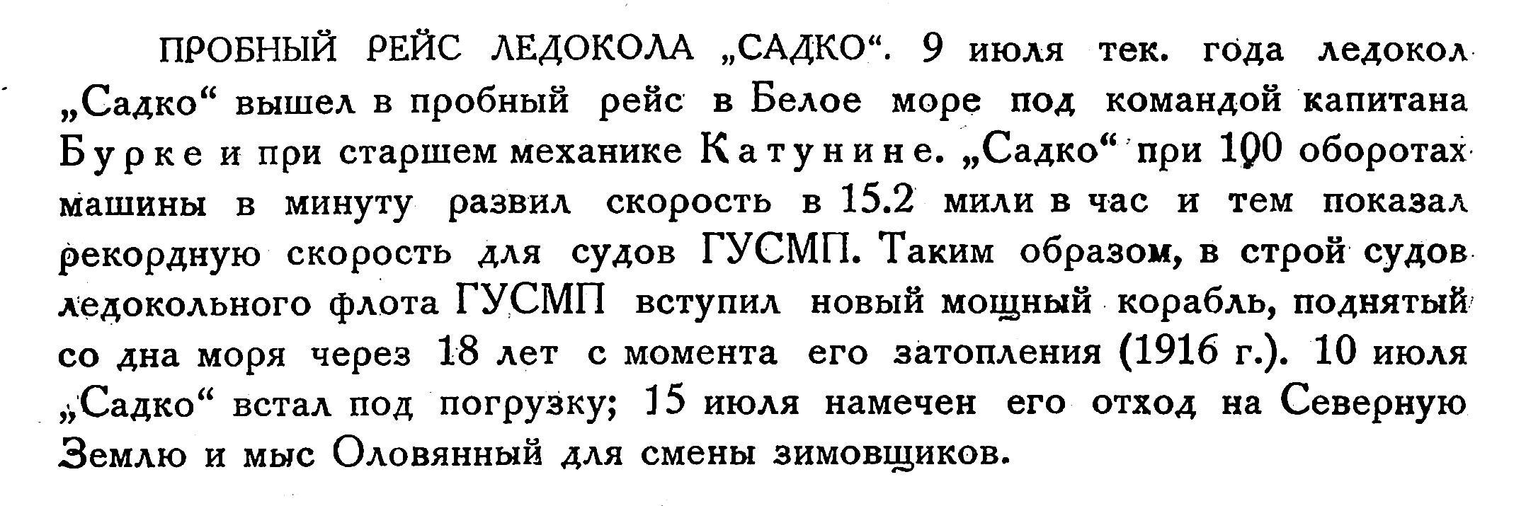 „Садко" — ледокольный пароход почти однотипный с „Малыгиным" — был куплен в Канаде в 1915 г., а в июне 1916 г. вблизи Кандалакши, чиркнув днищем о камень, получил пробоину длиною 18 м, захватившую два отсека судна, разделенных водонепроницаемой переборкой, и затонул на глубине 22 м.