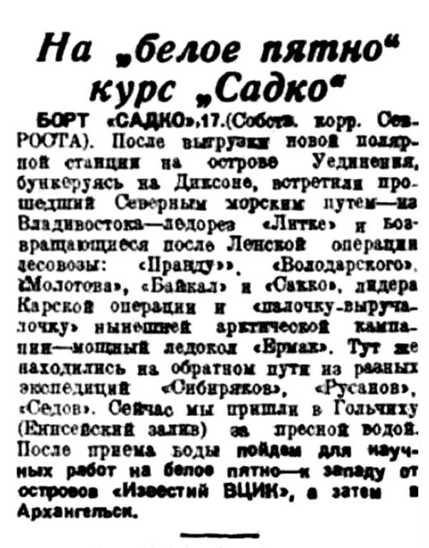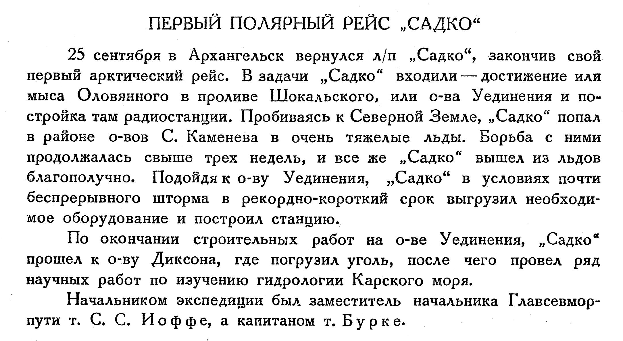 Рейс „Садко“ начался 22 июля. Основным заданием было создать полярную станцию на мысе Оловянном (на Северной Земле) или на о-ве Уединения, а дополнительным — снять зимовщиков с о-вов Сергея Каменева. Начальником экспедиции был Зам. Нач. Главного Управления Севморпути тов. С. С. Иоффе, капитаном „Садко“ — А. К. Бурке. На корабле находились научные сотрудники экспедиции — помимо автора этой статьи — гидрологи И. И. Львов и С. Я. Ганжинов и инженеры кораблестроитель Н. П. Шандриков и подрывник Н. Г. Черногубо в, а также будущие зимовщики новой станции, во главе с тов. Шманевым и строители, задачей которых была постройка станционных зданий.