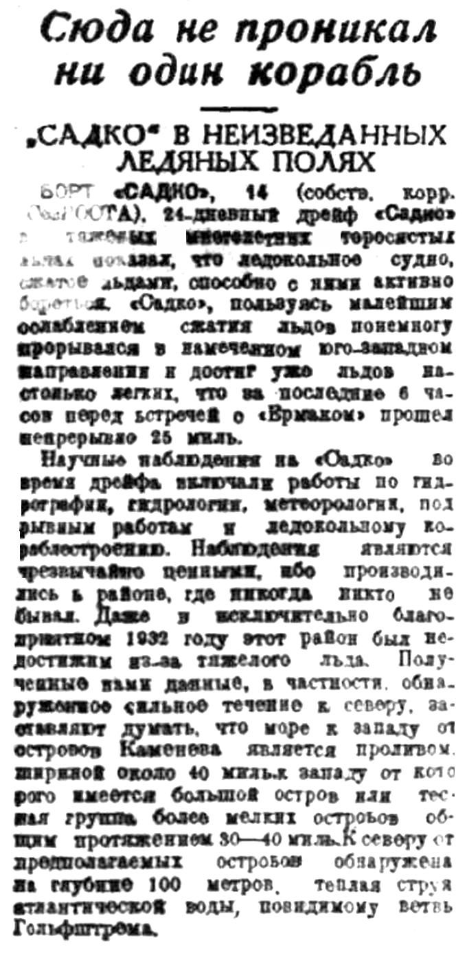 ЭКСПЕДИЦИЯ 1934 ГОДА НА Л/П „САДКО"Помимо обычного интереса, который вызывается всякой полярной экспедицией, в данном случае интерес представляет еще и то обстоятельство, что это был первый рейс „Садко“ после его 17-ти летнего пребывания под водой.