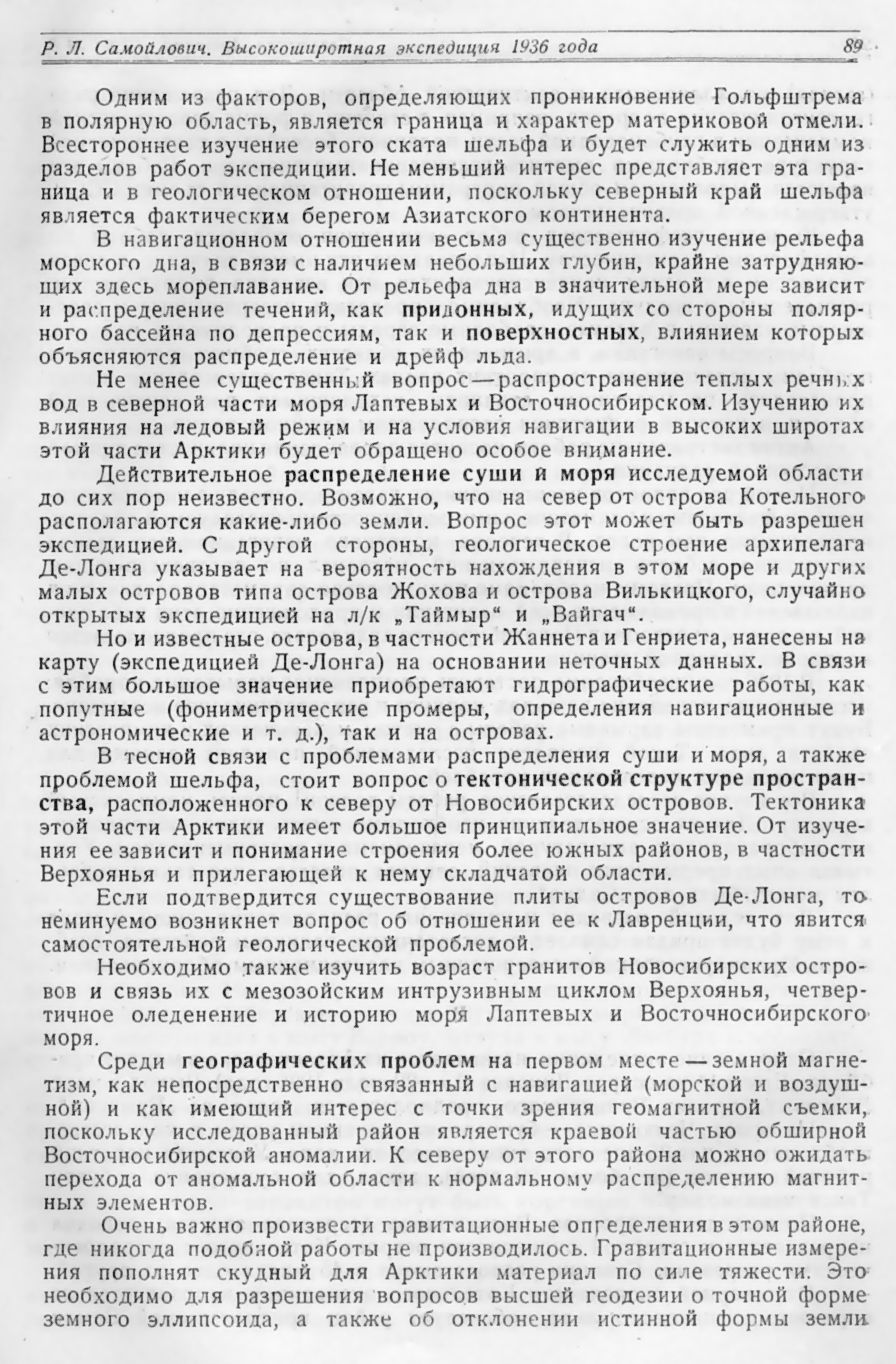 Очень важно произвести гравитационные определения в этом районе, где никогда подобной работы не производилось. Гравитационные измерения пополнят скудный для Арктики материал по силе тяжести. Это необходимо для разрешения вопросов высшей геодезии о точной форме земного эллипсоида, а также об отклонении истинной формы земли (гесида) от эллипсоида в арктической области. Для разрешения ряда геотектонических вопросов, например, о степени и форме изостатической компенсации в глубоководной части полярного бассейна, о тектонической структуре, необходимо выявить гравитационные аномалии. Работы эти являются выполнением общей программы гравитационной съемки СССР, утвержденной правительством.