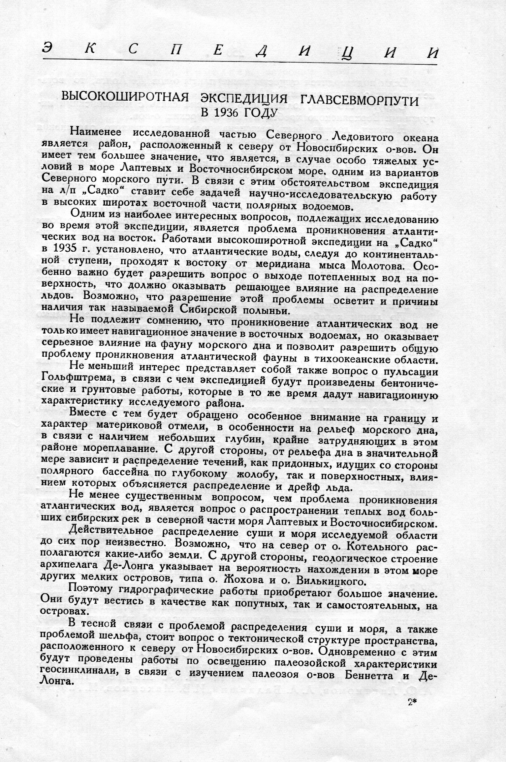 Между тем именно район к северу от Новосибирских островов представляет особый интерес, как вариант пути, соединяющий запад с востоком (в случае тяжелых ледовых условий в проливе Лаптева и невозможности прохождения глубоко сидящих судов через проливы Санникова и Этирикан). Работы высокоширотной экспедиции на л/к "Садко" в 1936 году должны проходить, главным образом, в этом трудно доступном северном районе.