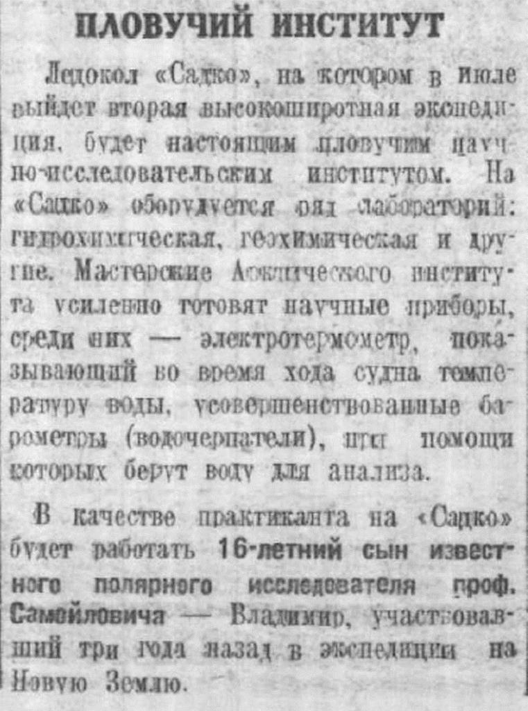 В качестве практиканта на «Садко» будет работать 16-летний сын известного полярного исследователя проф. Самойловича — Владимир, участвовавший три года назад в экспедиции на Новую Землю.
